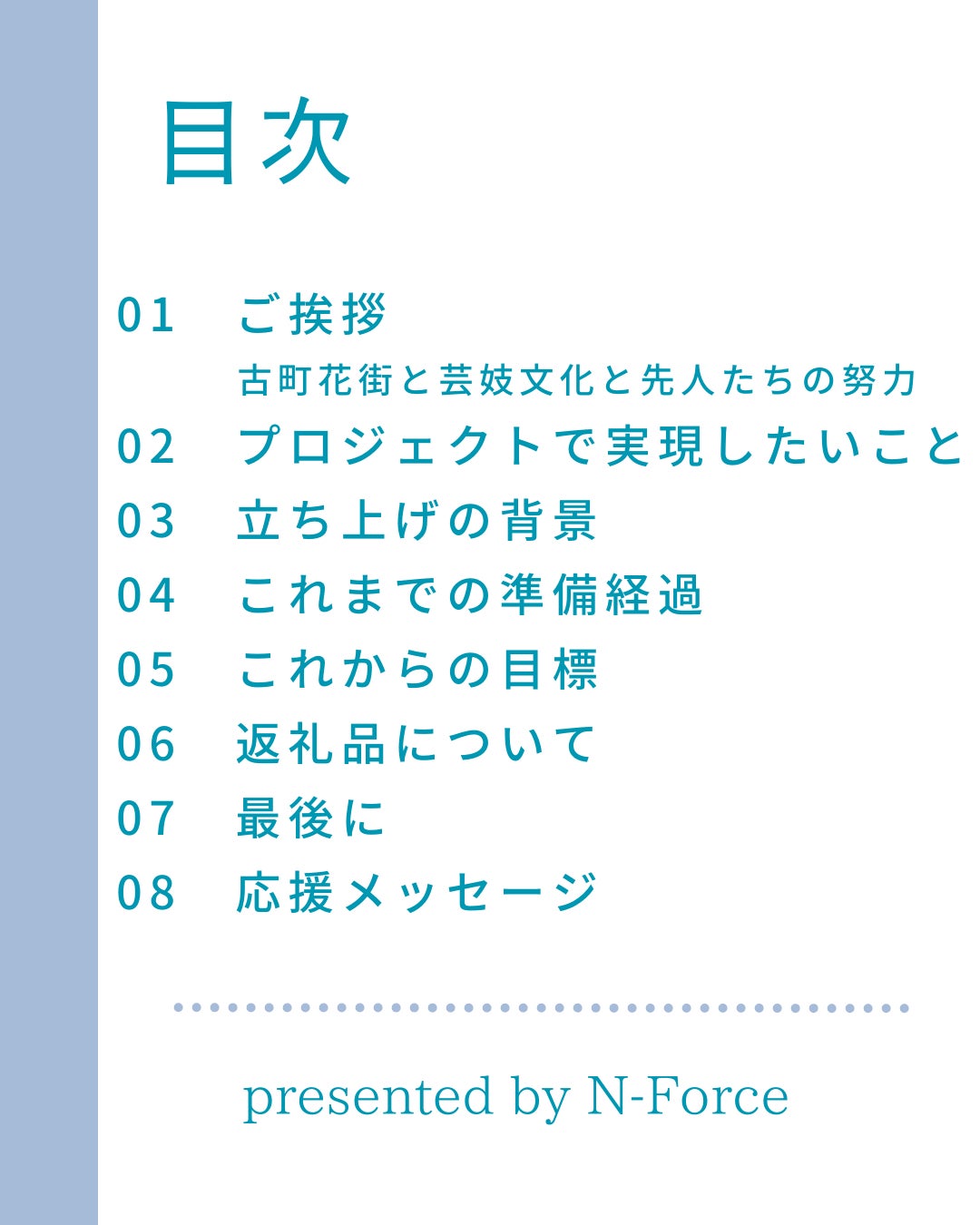 あの華やかであった花街は少しずつ衰退をはじめ、文化と歴史はあと数年の間にこのセピアが似合う街は消えてしまう危機があります。将来のお客様である若い世代には少し敷居が高いと思われている花柳界やお座敷への情報を発信をすることにより、古町花街を身近に感じてもらいたく、カップルやご夫婦での特別な日や誕生日にお座敷で非日常を過ごすという文化を醸成していければ、花柳界の将来へ続いていくスタートになると思っております。