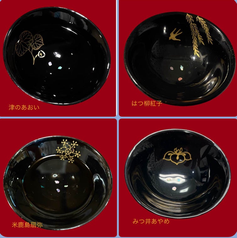 写真は4人のお姐さん漆器オリジナル酒盃です。