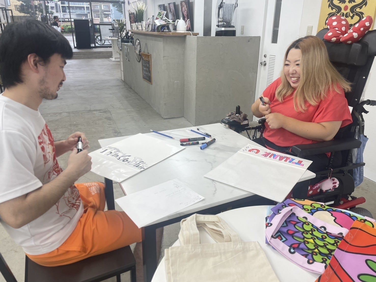 お引越ししてスロープや大きいアートの展示もできる様になりとても嬉しく思っている反面、半年以上探し回りようやく出会えた店舗が二階建てで、車椅子の皆様が入店が可能なスペースが前カフェよりはなく、悔しい思いもあります。。