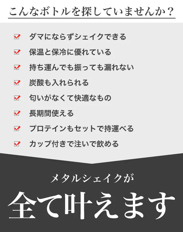 メタルシェイクは、ステンレス鋼SUS304を、内側・外側の両側に贅沢に使用しています。