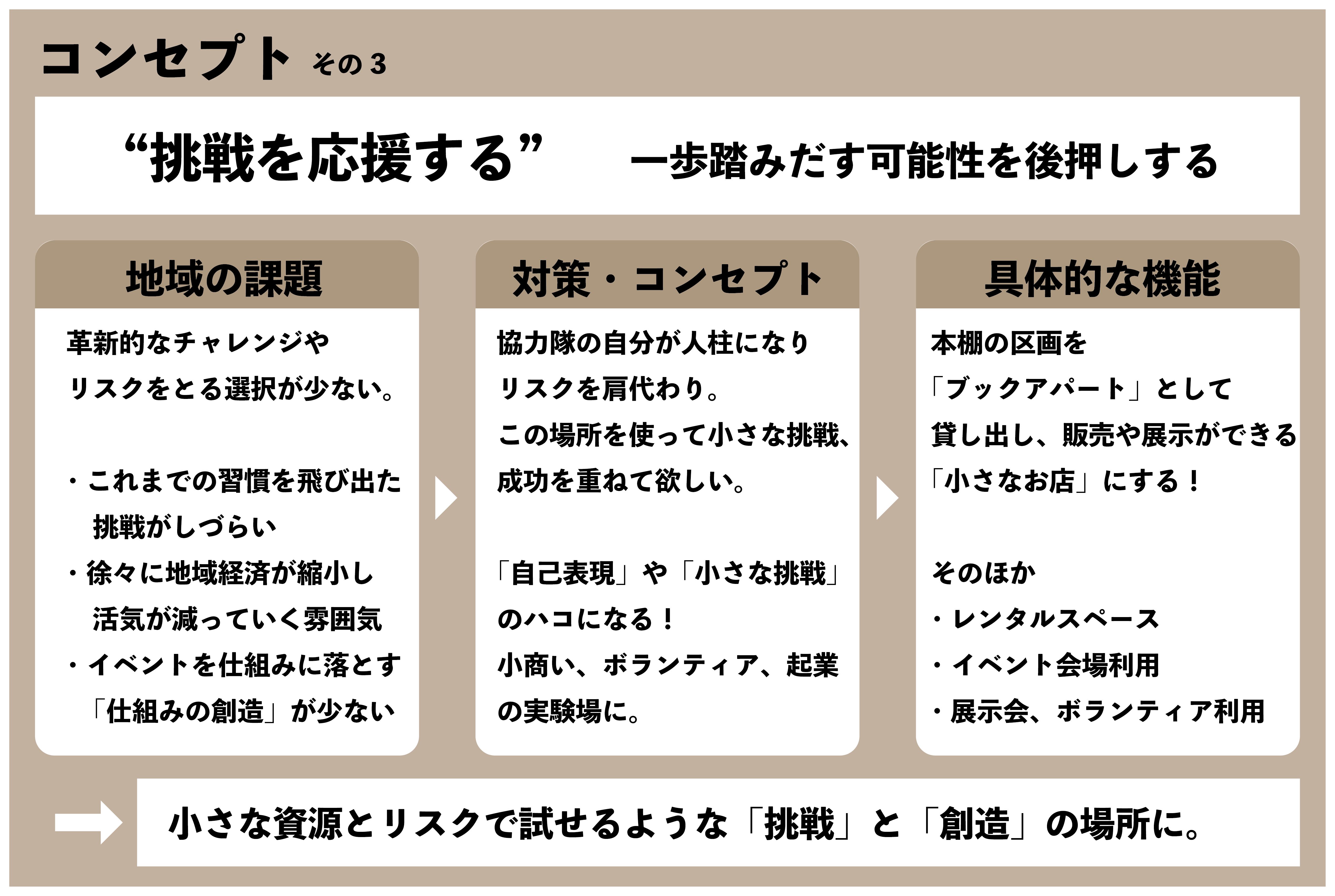 「やりたい!」を応援することで、小さな挑戦がたくさん生まれ、まちの活性化につながるお店を目指します。