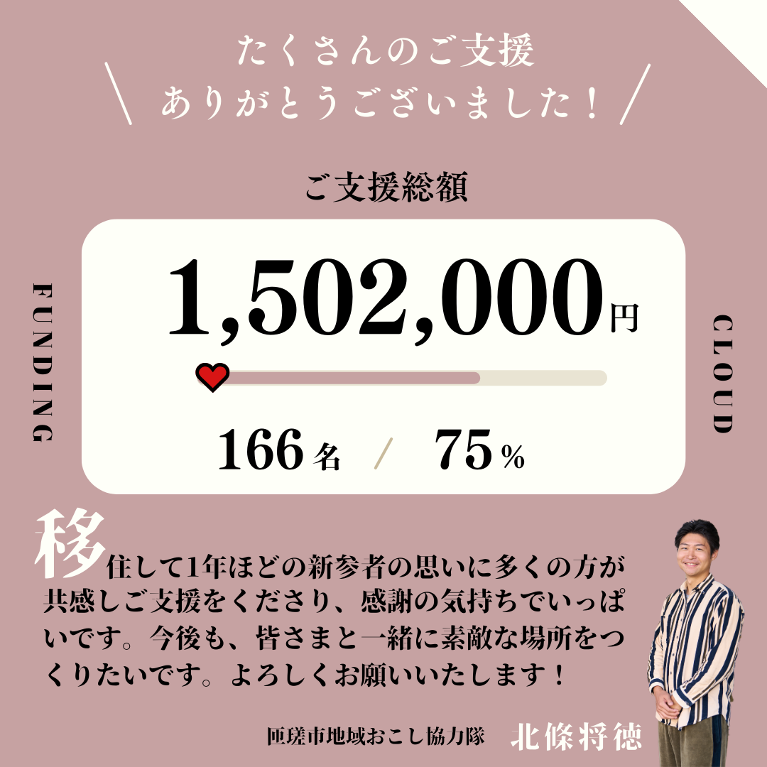 2024/02/02 19:30【ご支援くださり、ありがとうございました!】厳しい寒さが続きますが、皆さま変わらずお過ごしでしょうか。1月31日(水)に、40日間にわたって実施したクラウドファンディングが無事終了しました!皆さま、ご支援やシェアなど、本当にありがとうございました!!「166名のご支援者さまから、総額1,502,000円」のご支援が集まりました。目標額を200万円に設定していたため、「目標達成しなかったのか…」と残念に思われる方もいらっしゃるかもしれません。ですが、この結果は私の当初の想定を超える本当にありがたい成果です。というのも、匝瑳市に来てまだ1年2ヶ月の”ヨソ者・若者・バカ者”の私が掲げるビジョンに対して、ここまで多くの方がご支援いただけるとは思っていなかったからです。仮に支援額がほとんど集まらなくても、できる範囲で少しずつカタチにすることで、地域の方に徐々に理解していただき、応援してもらうことを目指そう。そう考えつつも、事業の具体的な姿を知っていただくことも大切と考え、この目標額に設定したのでした。この結果には、感謝の想いしかありません。それと同時に、皆さまからの期待をいただくことで、身が引き締まる思いです。本当にありがたいことに、ブックカフェ&リユースぐるりのことを知ってくださり、声をかけて応援の言葉をいただく機会も増えてきました。直接お会いしたことのない方からもメッセージをいただいたり、いろんな所で話題にしてくださったりしているようで、毎回嬉しく思います。移住して、地域おこし協力隊として市を盛り上げる仕事を拝命しているとは言え、新しい土地での生活に対して心のどこかで寂しさや不安を感じていたのかもしれません。このプロジェクトを進める中で、応援してくださったり、関わる方が増えたりすることで、本当の意味で地域の仲間入りの一歩を踏み出せたような気がしています。本当に、ありがとうございます。地域のため、皆さまのため、そしてより良い未来の社会を作るために、微力ではありますが、感謝の気持ちを持ちながら一歩一歩がんばりたいと思います。これからは、プロジェクトの実現に向けてギアを上げて活動を進めます。まずは、2月24日(土)のグランドオープンイベント。町内のお囃子連をお呼びしたり、市内のキッチンカーさんに出店いただいたりと、地域のお店として楽しんでもらえるようにさまざまな企画を準備中です。ぜひ、お誘い合わせの上、お越しください。ほとんど毎日DIYの作業をしているので、塗ったり作ったりに興味のある方がいらっしゃれば、ぜひお手伝いいただけますと嬉しいです。繰り返しになりますが、皆さま本当にありがとうございました!これからも、よろしくお願いいたします。匝瑳市地域おこし協力隊ブックカフェ&リユースぐるり代表北條将徳 もっと見る