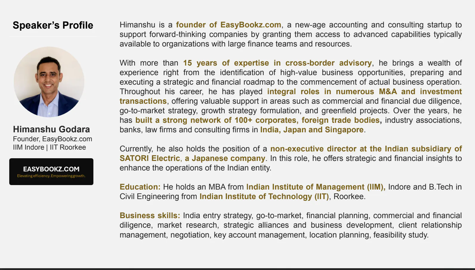 Himanshu氏はインド大手コンサルタント会社で15年間活躍し、ムンバイでFintechのスタートアップ事業を創業した最難関の理工系大学インド工科大学を卒業、MBAを取得した若きインド人経営者です。