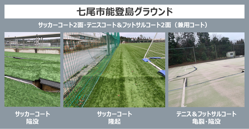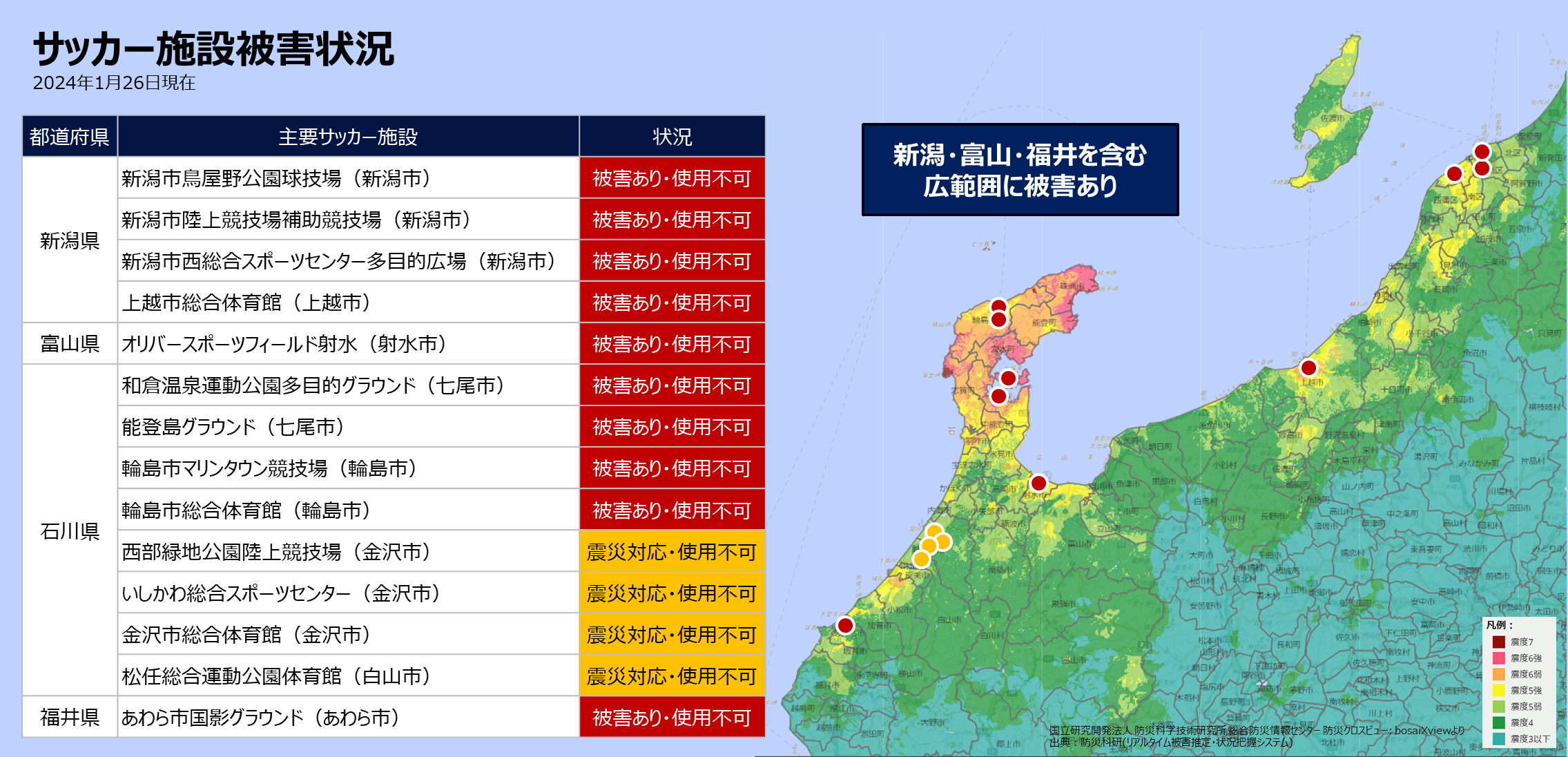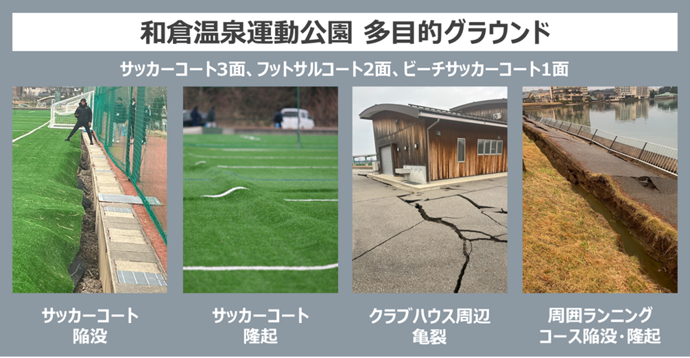 能登半島地震により、北信越地域の10ヶ所以上のサッカー施設が大きな被害を受け、営業再開の目処が立たない状況が続いています。避難生活が長引いている子どもたちは身体を動かしたりして遊ぶ機会を失っており、被災6市町(七尾市、輪島市、珠洲市、志賀町、穴水町、能登町)の24チーム・672人の登録チーム・選手たちは、通常のサッカー活動が困難な状況となっています。