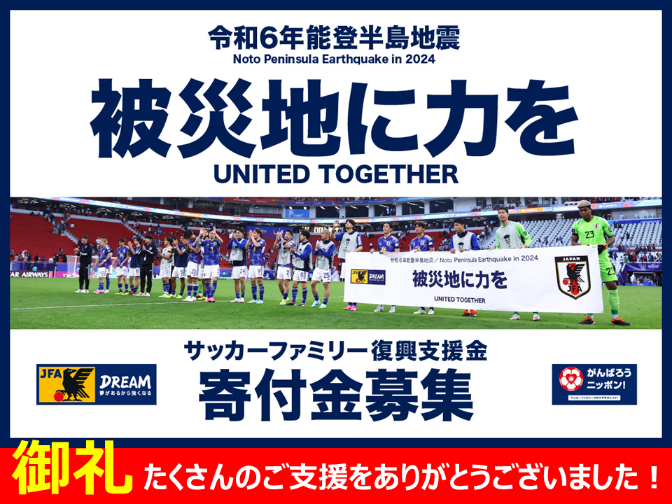 この度の能登半島地震で犠牲になられた方々へ哀悼の意を表しますと共に、被災された方々へ謹んでお見舞い申し上げます。今も地震の影響で辛い思いをされている方が大勢いらっしゃると思いますが、一日も早く皆様に「日常」が戻ってほしいと願っています。被災されたサッカーファミリーの皆さんが“サッカーを楽しむ”という「日常」を取り戻すためにも、このサッカーファミリー復興支援金のご寄付へのご協力をよろしくお願いいたします。