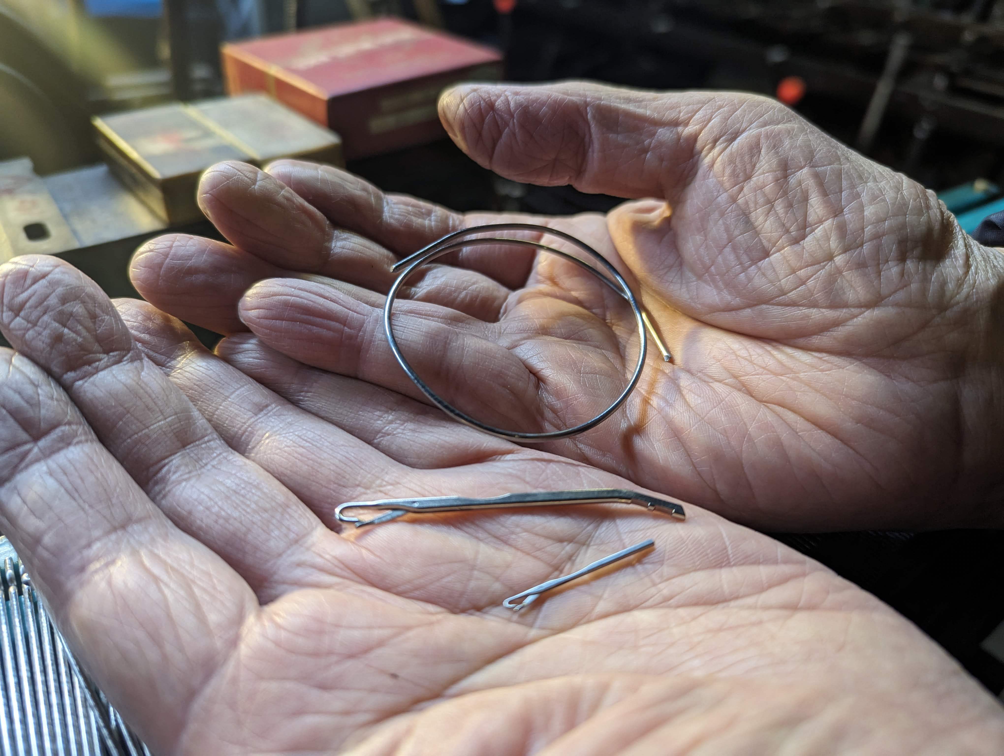 作り手目線で恐縮ですが、私たちの普段作っている工業用編み針、通称「ベラ針」というものをぜひ見ていただきたいと思い、ご用意しました。