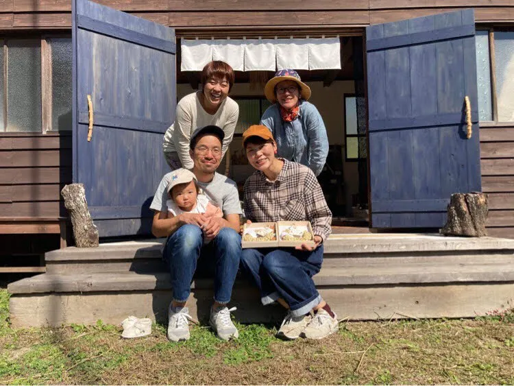 手仕事屋manomanoさん(後方左から 小磯さん 井上さん) と私たち家族。岡山県美作市で活動されています。