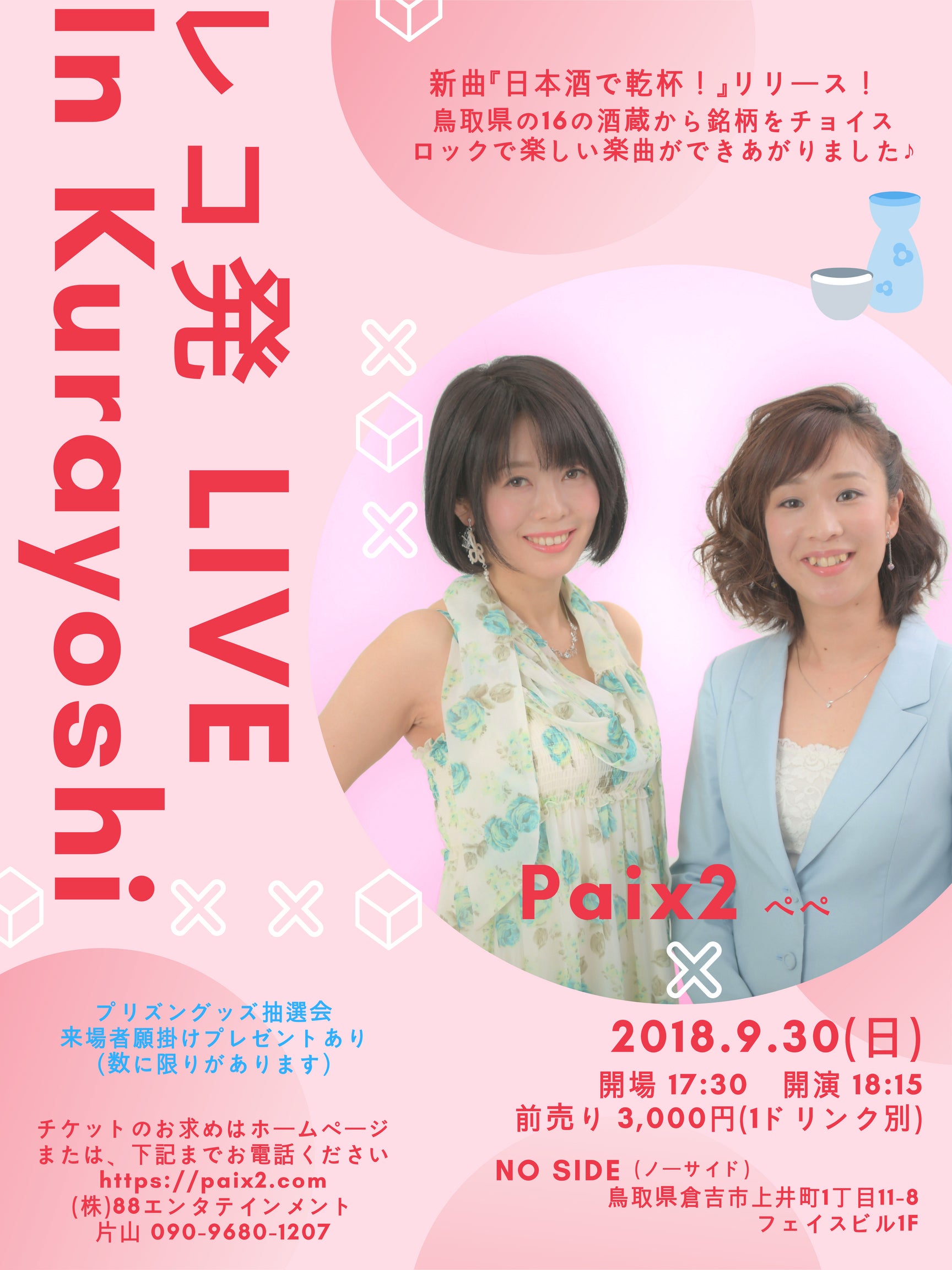 Paix2です。おかげさまで新曲『日本酒で乾杯!』を各地のイベントや刑務所内でも(笑)歌わせていただいてます。 そして9/30には、鳥取県倉吉市にてレコ発ライブが決定しました! お近くの方は、ぜひ、遊びにいらしてください。 ご来場いただいたみなさまにはお一人ずつ願掛けプレゼント、そして、刑務所作業製品やPaix2にまつわる「何か」が当たる、抽選会も予定しています。 大人はお酒で、未成年はソフトドリンクで、みんなで盛り上がりましょう♪ チケットのお申し込みは → こちら