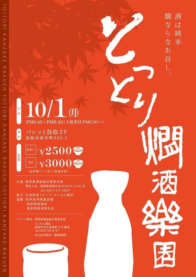 ストレッチゴールとして設定してました第三目標の「鳥取県のイベントで新曲のお披露目ライブをします!」が実現します! 鳥取県の、それもお酒のイベントということで、本当に嬉しいです! ぜひお近くのみなさま、遊びにいらしてください! 10/1(月)『とっとり燗酒楽園』 場所:パレットとっとり 2F(鳥取市弥生町323-1) 入場受付:18:30~ START:18:45~20:45 参加費 前売:2,500円(特製おちょこ付) 当日:3,000円(特製おちょこ付) 一品料理ブースあり(別途有料) 主催:鳥取県酒造組合東部支部 お問い合せ:鳥取県鳥取市吉方107-6 ビルA 2F TEL:0857-22-3897 チケットは当日参加される下記の店舗さんで販売中です ★鳥取県酒造組合東部支部 ★たにもと酒店(鳥取市末広温泉町274番地) TEL:0857-24-6781 ★れんが亭(鳥取市末広温泉町357 Aビル2F) ★御銀(鳥取市今町2丁目118 OKビル1F) ★砂丘屋(鳥取市今町2-219 チョコビル1F) ★MIRAI restaurant&cafe(鳥取市末広温泉町163 MKビル 2F・3F)