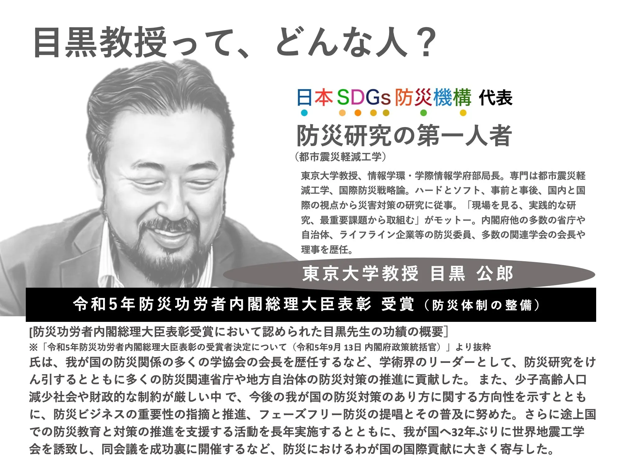 1億人の総力結集で、日本の防災力を向上し、自助・共助・公助全てにおいて適切な災害対策の最大化を目指します。ヒーローみたいな東大教授!そんな目黒教授の提唱に賛同する人や企業が集う「目黒公郎教授が牽引する防災チーム」として発足し、2024年度のチームの応援型公式メンバーを募集します。