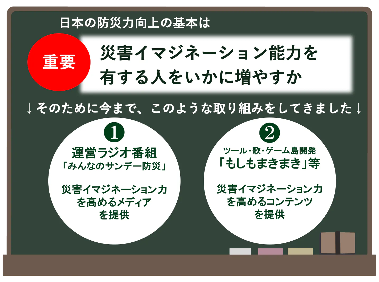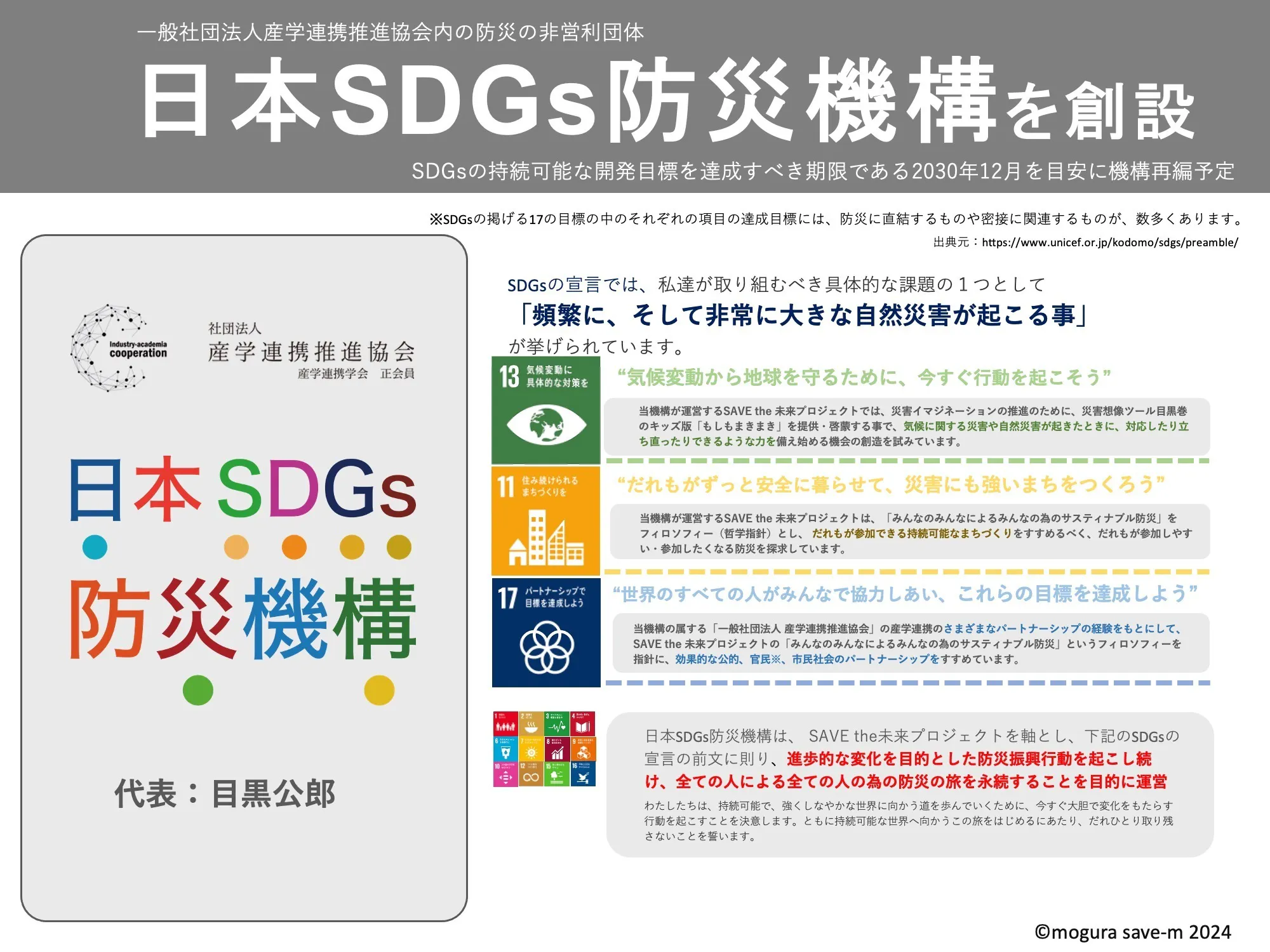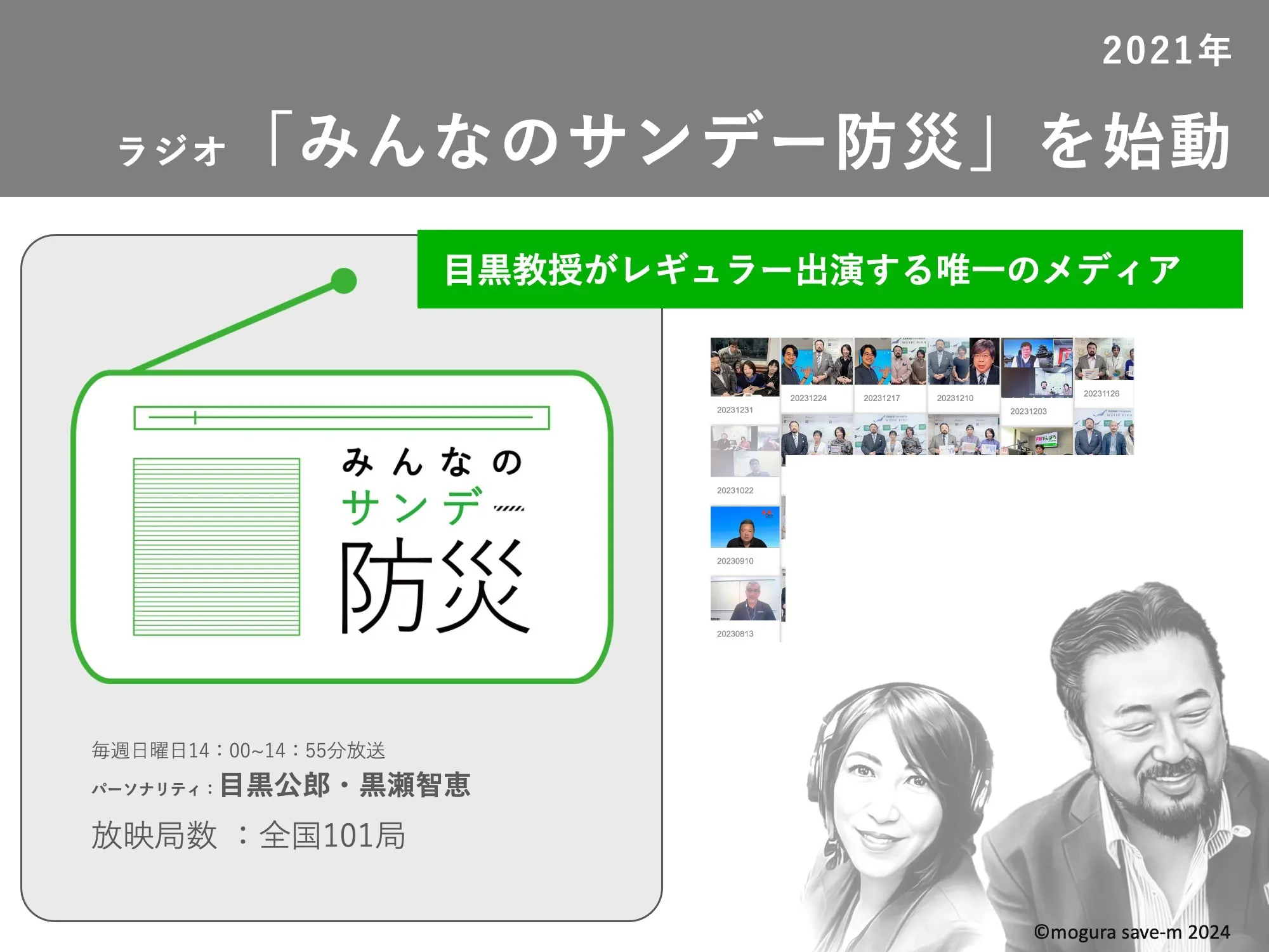 目黒公郎教授が率いる日本SDGs防災機構の防災プラットフォーム「SAVE the 未来プロジェクト」では防災啓発の重要性を認識し、ラジオ番組・イマジネーションツール・ゲーム展開などにより、防災の啓発活動に注力してきました。