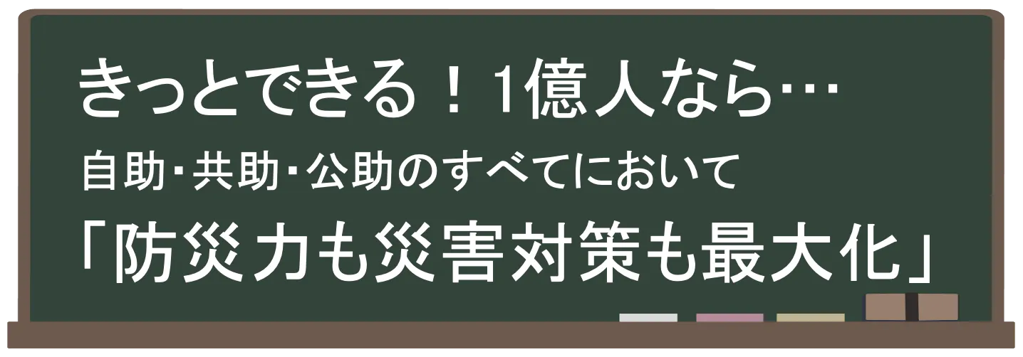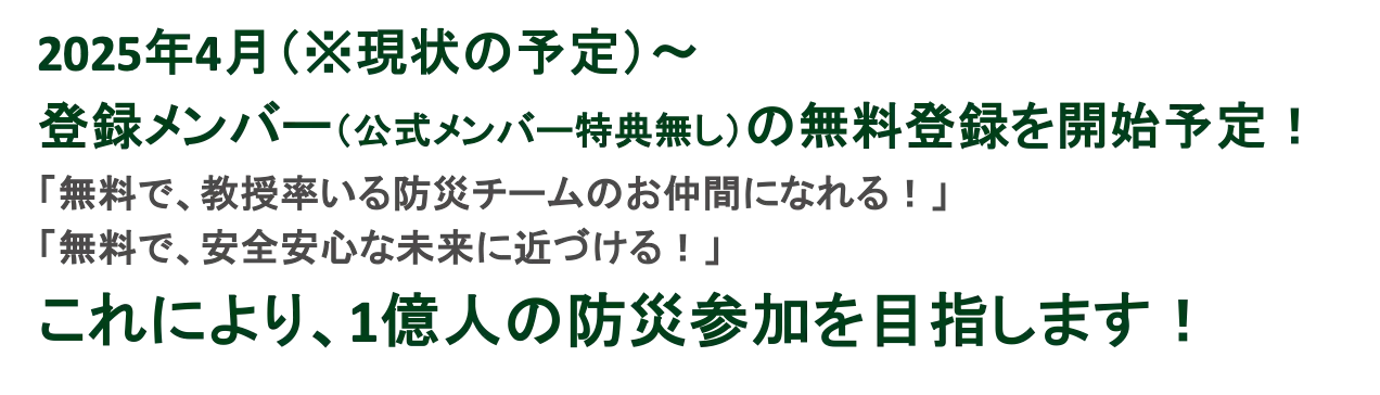 ●防災のお仲間=1億人を目指しています(みんなのみんなによるみんなの為の防災チームへ)。