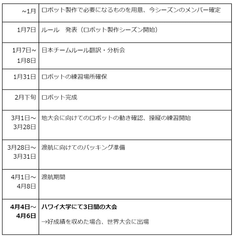 2023年夏から資金集めやロボット製作のための準備などの活動を行っていました。1月からは本格的なFRC製作が始まり、対面での活動の頻度が上がりロボット製作や戦略を立てるなど、活発にFRCに向けた準備をしています。