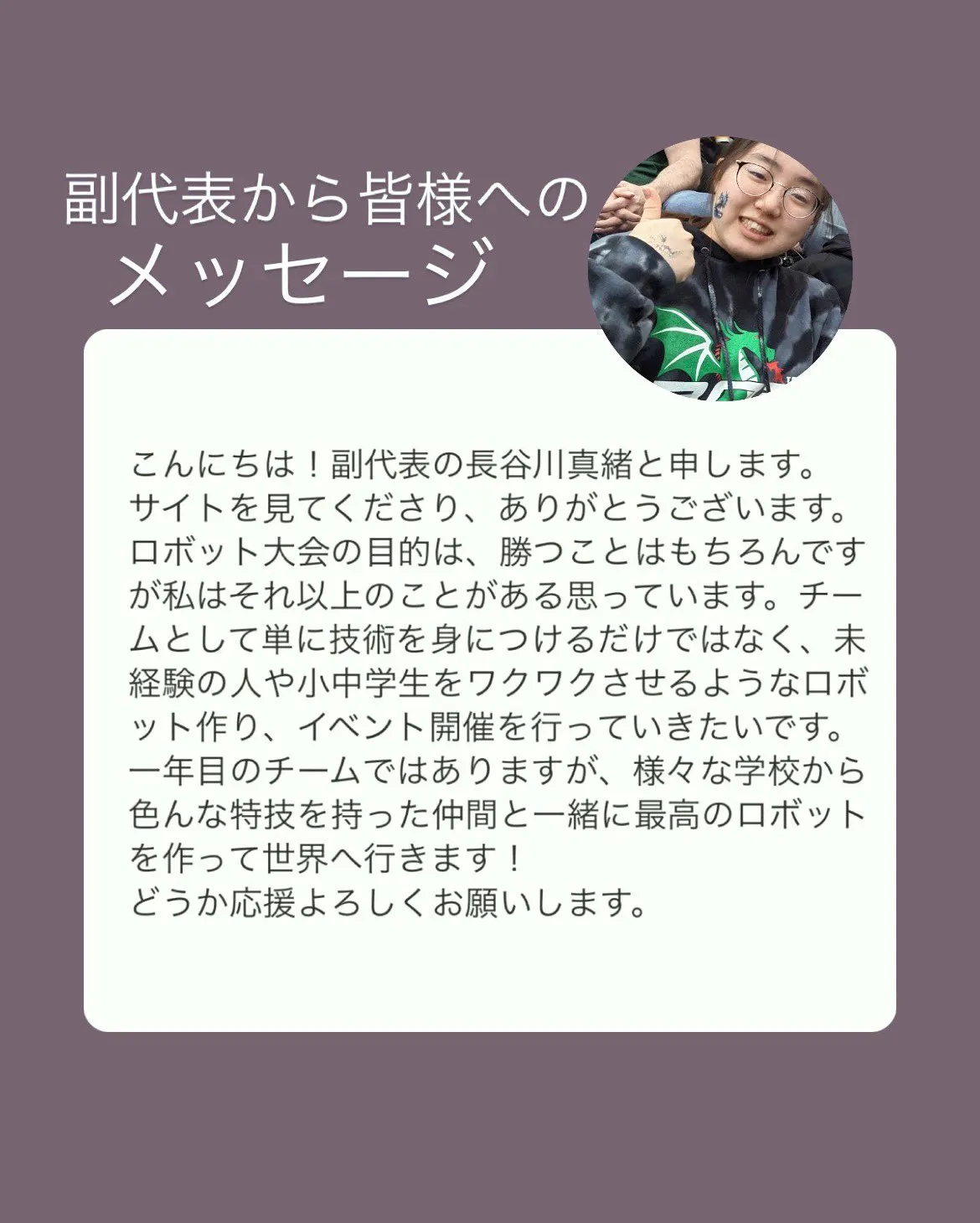また、海外に住んでいた経験があるメンバーも多く、英語含む多言語を話せるメンバーたちが多数います。さらには今までロボットや理系の経験がないメンバーもいます。メンバー自身もモノづくりを通して、様々な人と交流し、今までの生活では体験できなかった学びを受けることを目指しています。
