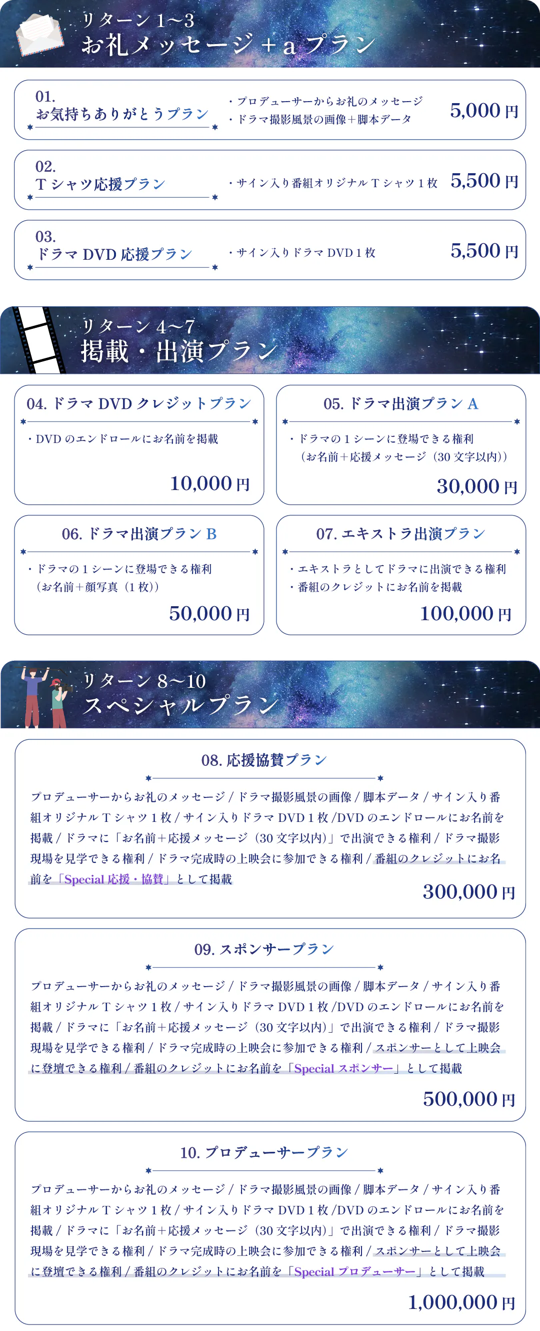 このプロジェクトではドラマ制作費をご支援いただくことだけではなく、このドラマに興味をもってくださる仲間を増やし、ドラマを一緒に創り上げることで、皆さんと感動を分かち合い、より多くの人々に届けることをゴールにしています。