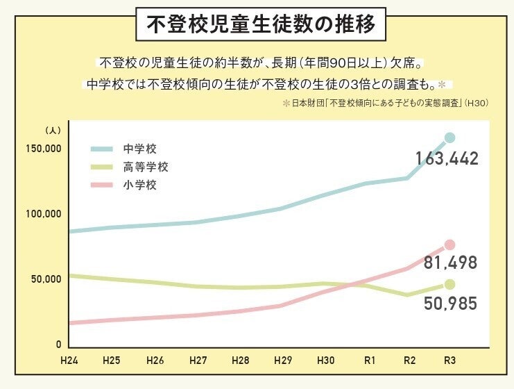 年間の出生数が80万人を割りこみ、少子化の加速が叫ばれているにも関わらず、不登校児童の数は増加し続けています。