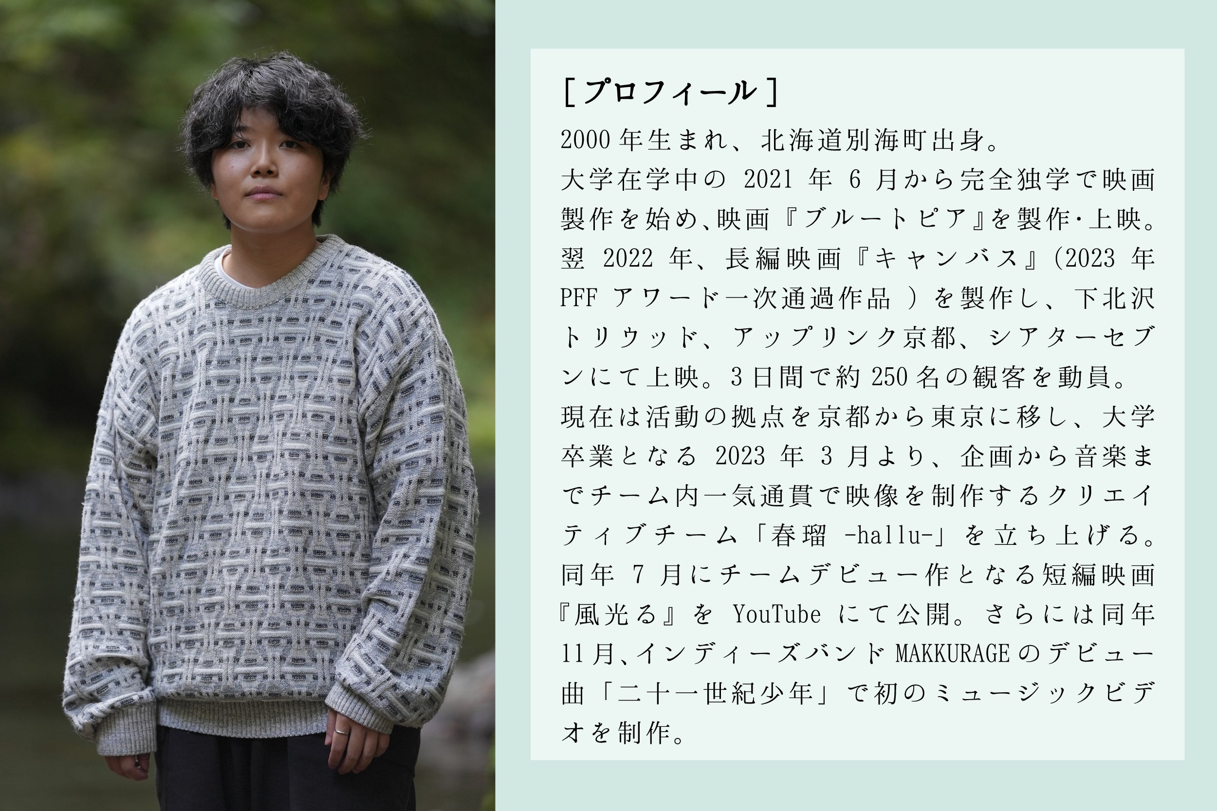 必死で映画を続けているうちに、池田町から偶然掛かった声。制作が決まって初めての訪問を終えてから、そこが祖父が育ったという地域で、自分がまだお腹の中にいたころ訪れたことのあるらしいまちと知りました。 不思議なご縁に感謝をしながら、池田で出会った魅力的な方々の背中を追って、希望のうたを贈ります。 これが春瑠-hallu-にとって、自分にとって、新たな扉になることを確信しています。