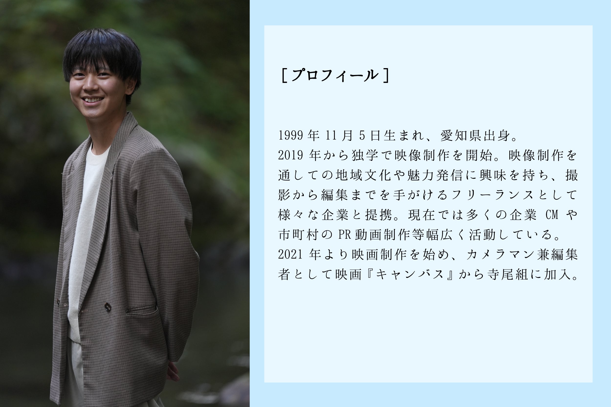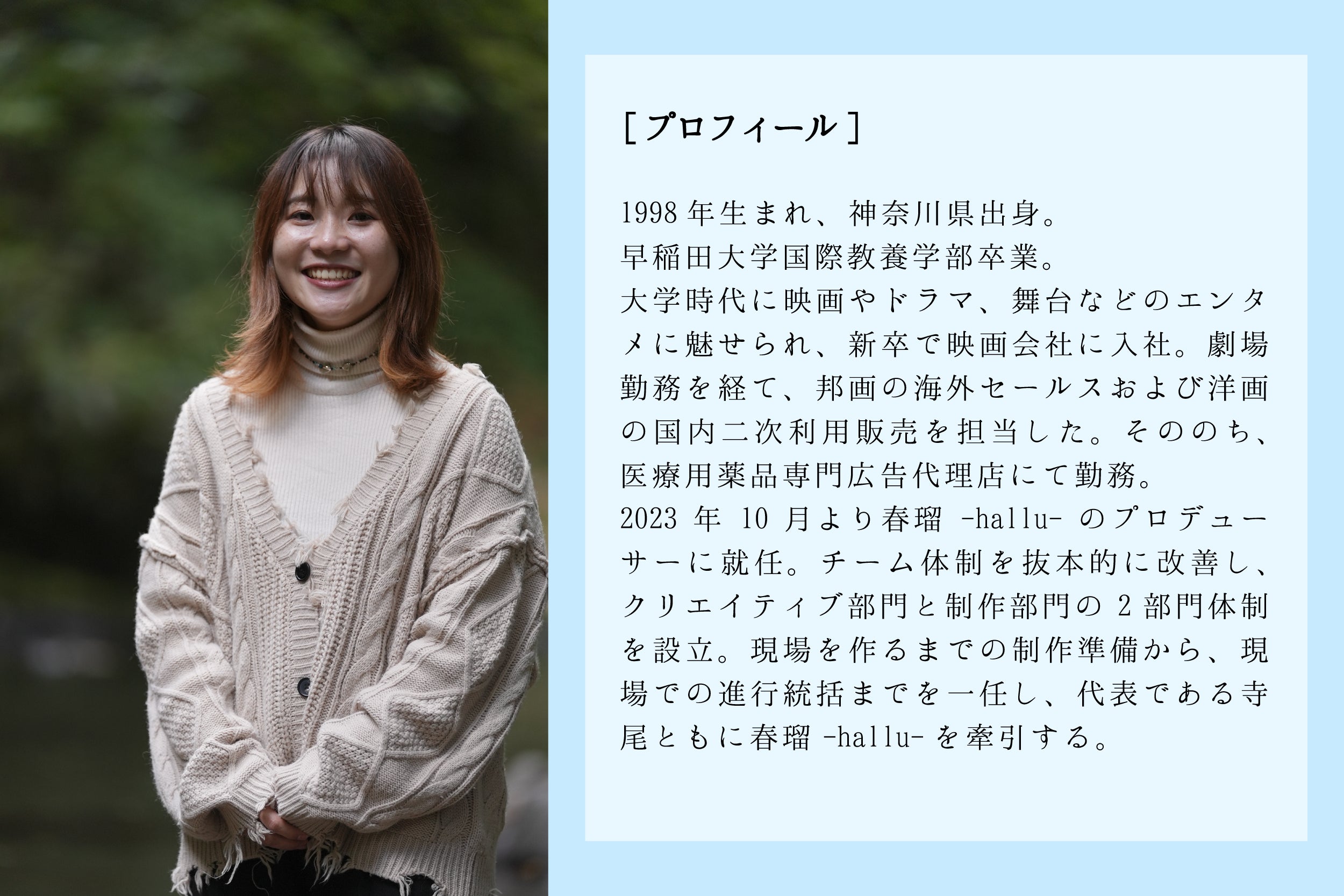 【コメント】 春瑠-hallu-のカメラマンとして、これまで3作品の撮影・編集を担当してきました。監督とは、毎作品ごとに新しいことを取り入れながら制作を進めており、今作でも「つくる」ことに対して新鮮さとこだわりを持って制作に取り組みます。