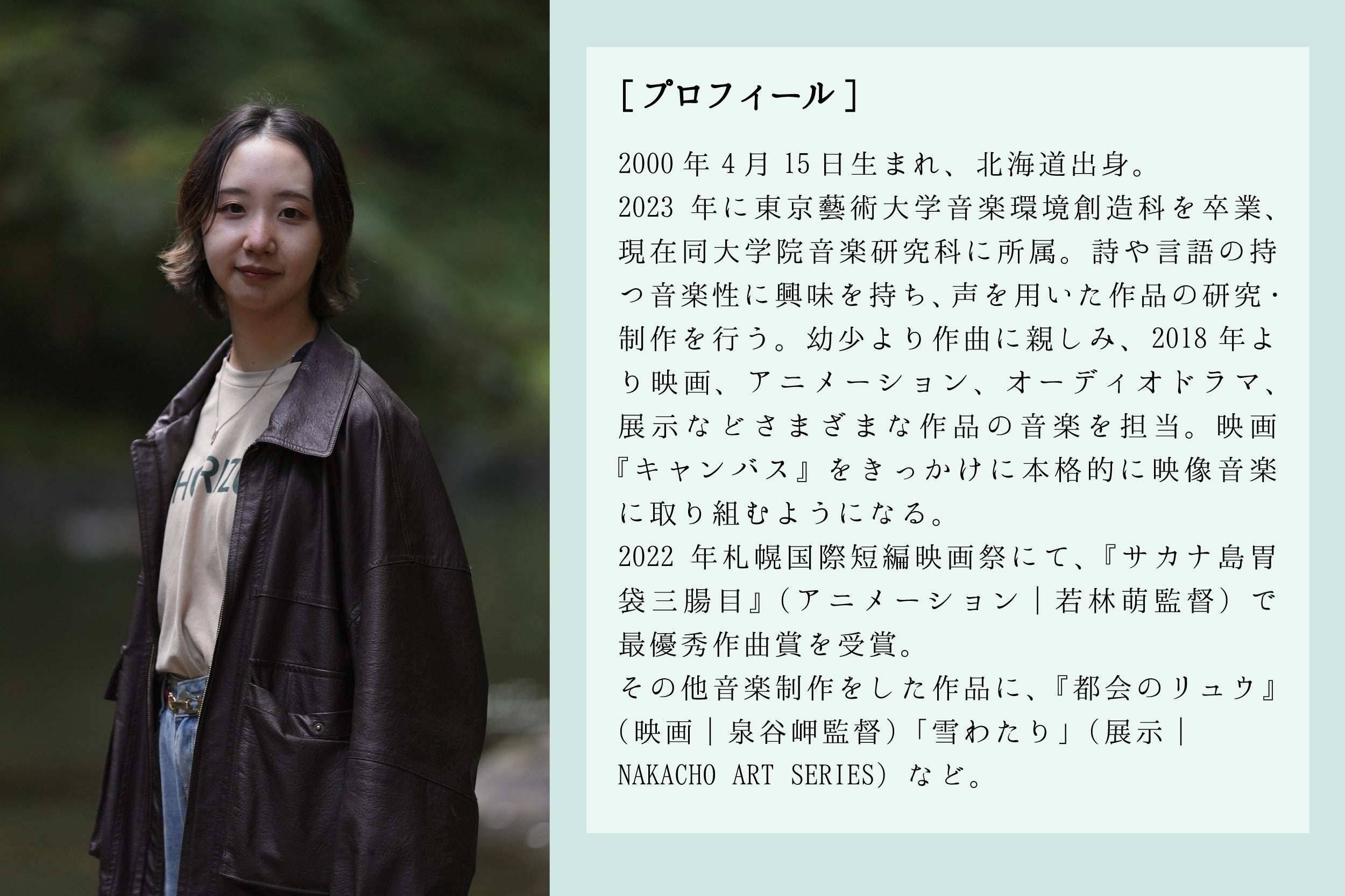 【コメント】 池田町を訪ねた際、どうしたらこの純度の高い、澄んだ空気を作品に閉じ込められるだろうかと思いました。この場所で制作できることは、大きな挑戦であると共に、またと無いワクワクする体験です。