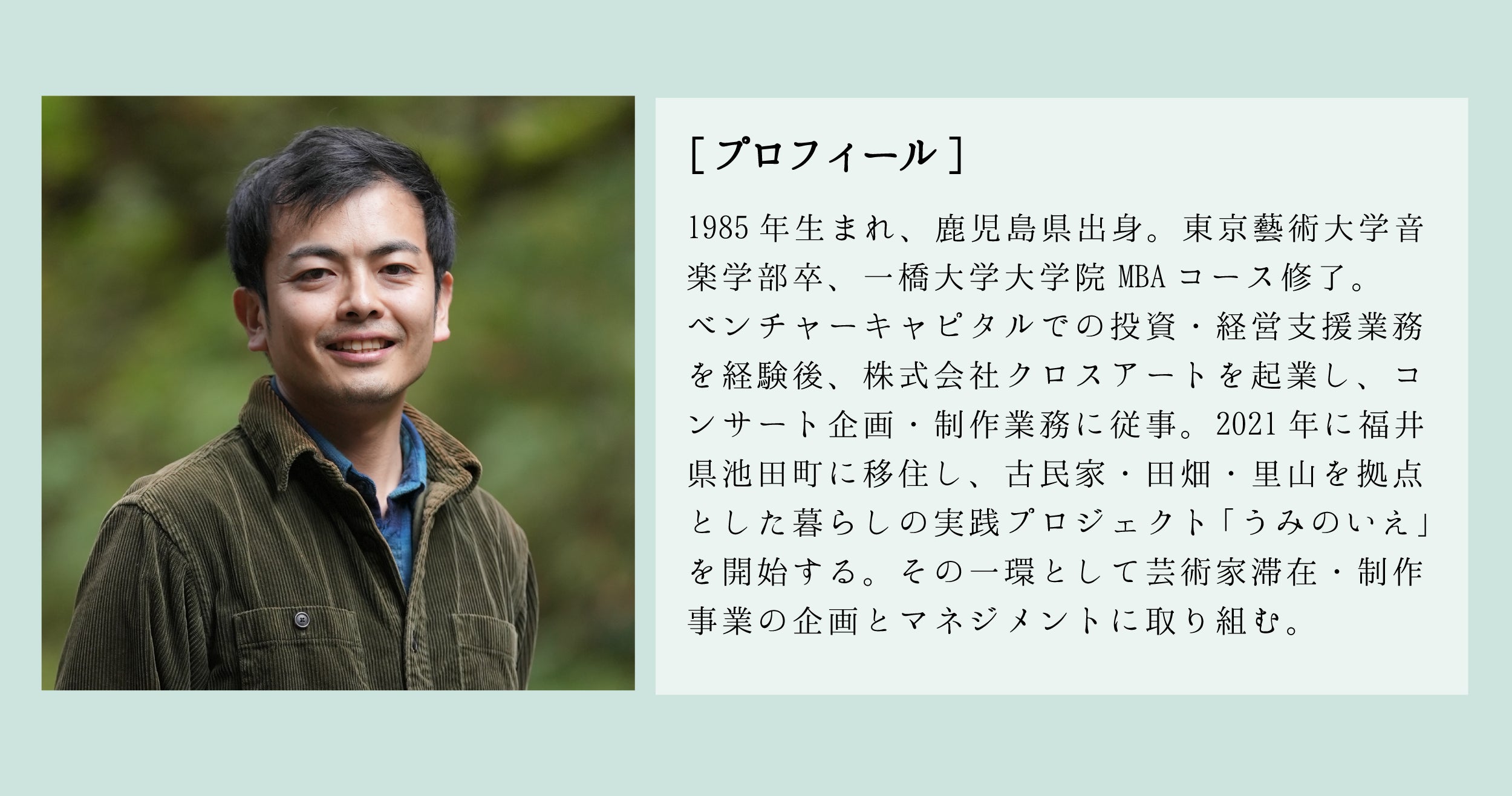【 代表・米村 智裕氏よりコメント】 うみのいえ は、古民家や集落の田畑・里山を拠点として、「みずから生きる」を主題に、衣食住・探究と創造・学びと教育、という暮らしの3つの要素を取り組むものです。その探究と創造の営みとして芸術家をうみのいえに招き、滞在・制作の場を提供する「芸術家滞在事業(いわゆるArtists In Residence)」も活動の1つとしています。 この活動を通じて、芸術家が普段とは異なる環境やモチーフで活動を深められたら、という想いです。それに、僕らや僕ら地域がこれまで気づかなかった土地の匂いや知らなかった感情を自らの中に発見できたら、それは皆の幸せに繋がるだろうと考えています。