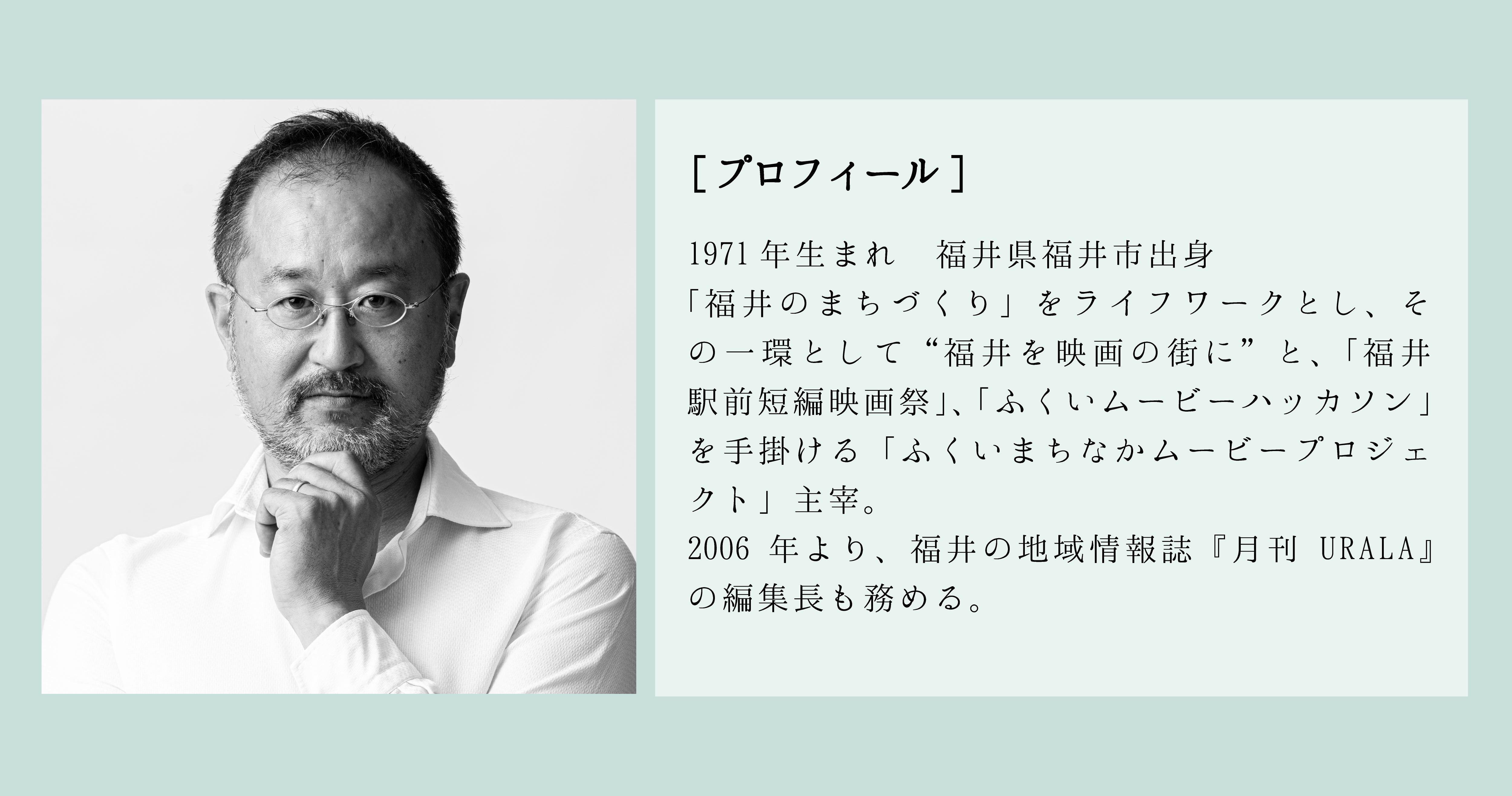 【コメント】 職業・年齢・プロアマ問わず、誰もが映画製作ができる場になり、それを支えてくれる街になっていくことで、「福井は映画の街」が出来上がっていくと思っており、このように福井で撮影いただくことに感謝しています。 映画とは、この街の風景、この街の人の営み、この街の音を未来に残していける“文化”でもあります。この映画を通じて、映画に関わる方、観てくださる方が福井を知り、福井を好きになっていただけたらと願ってやみません。