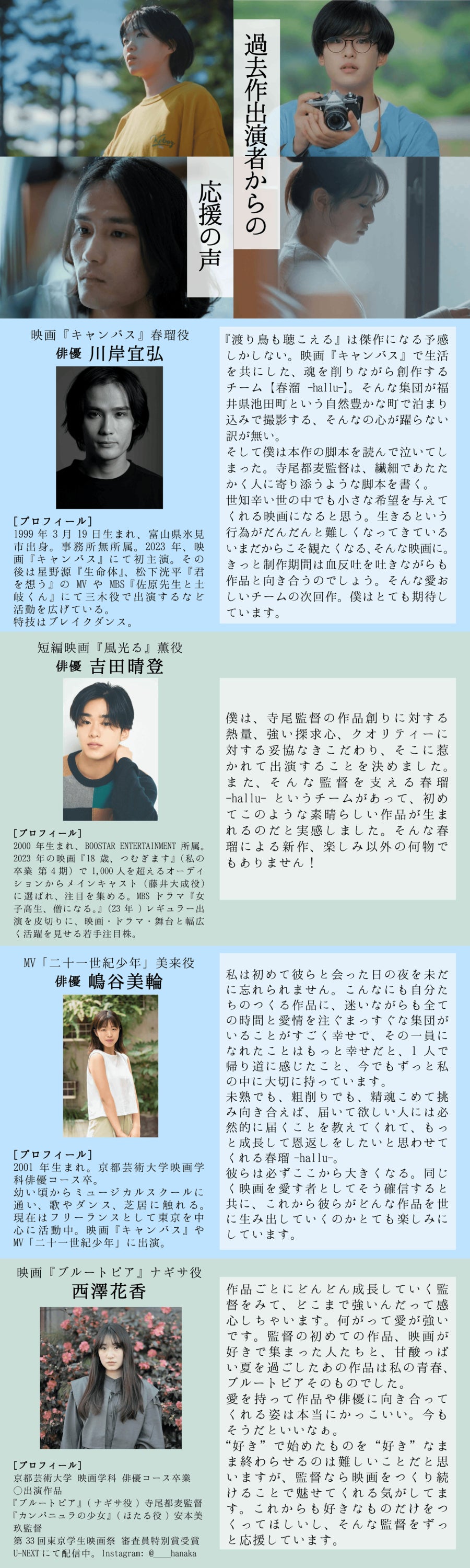 監督の過去4作の主演俳優 ・川岸宜弘さま ・吉田晴登さま ・嶋谷美輪さま ・西澤花香さま からも応援のメッセージをいただきました。