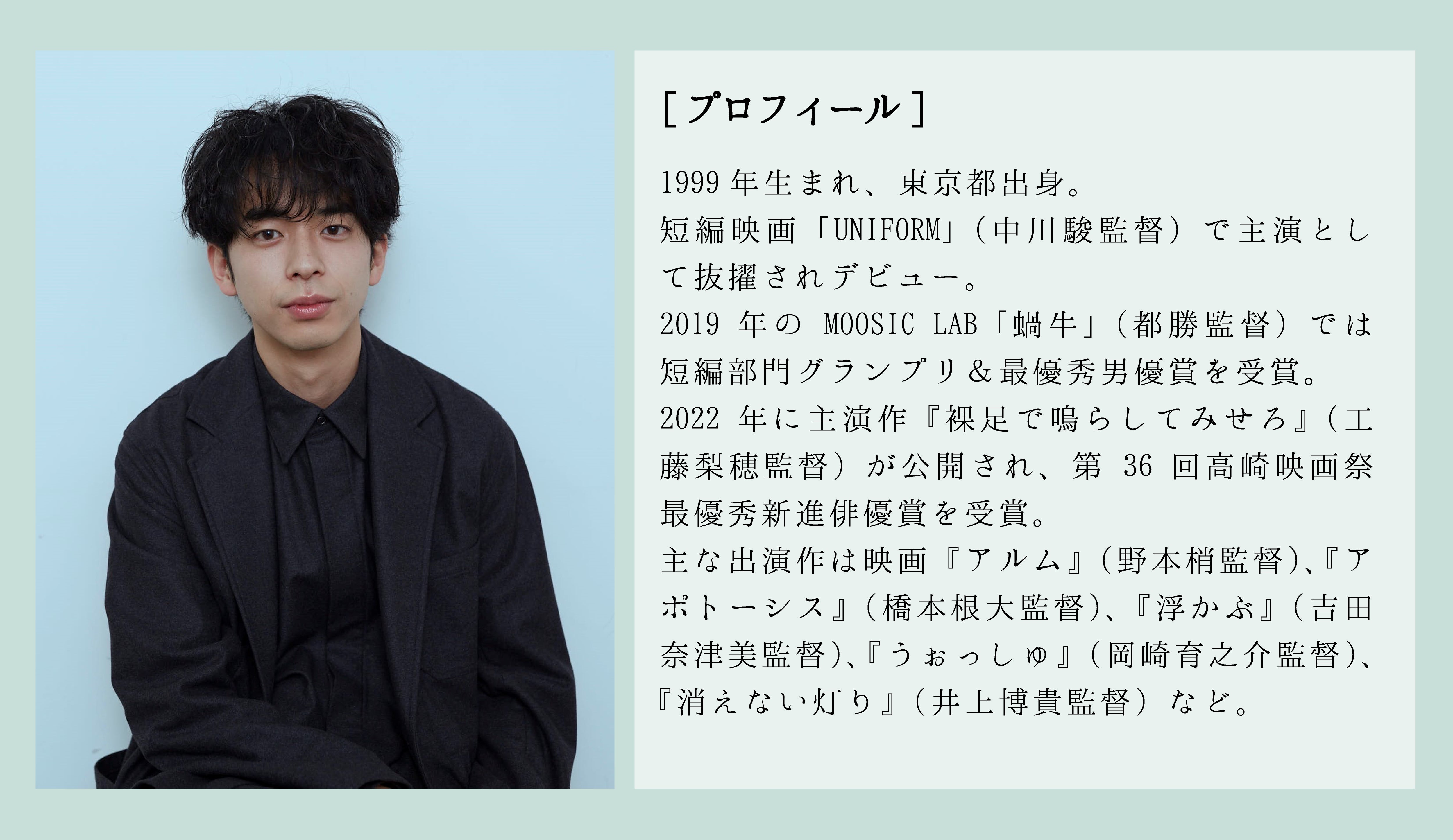【コメント】 小山誠太役を務めます、一ノ瀬竜です。 漠然と、どこか遠くへ行きたいと思っている誠太に強く共感しました。誠太役としてこの作品に携われることが、とても嬉しいです。