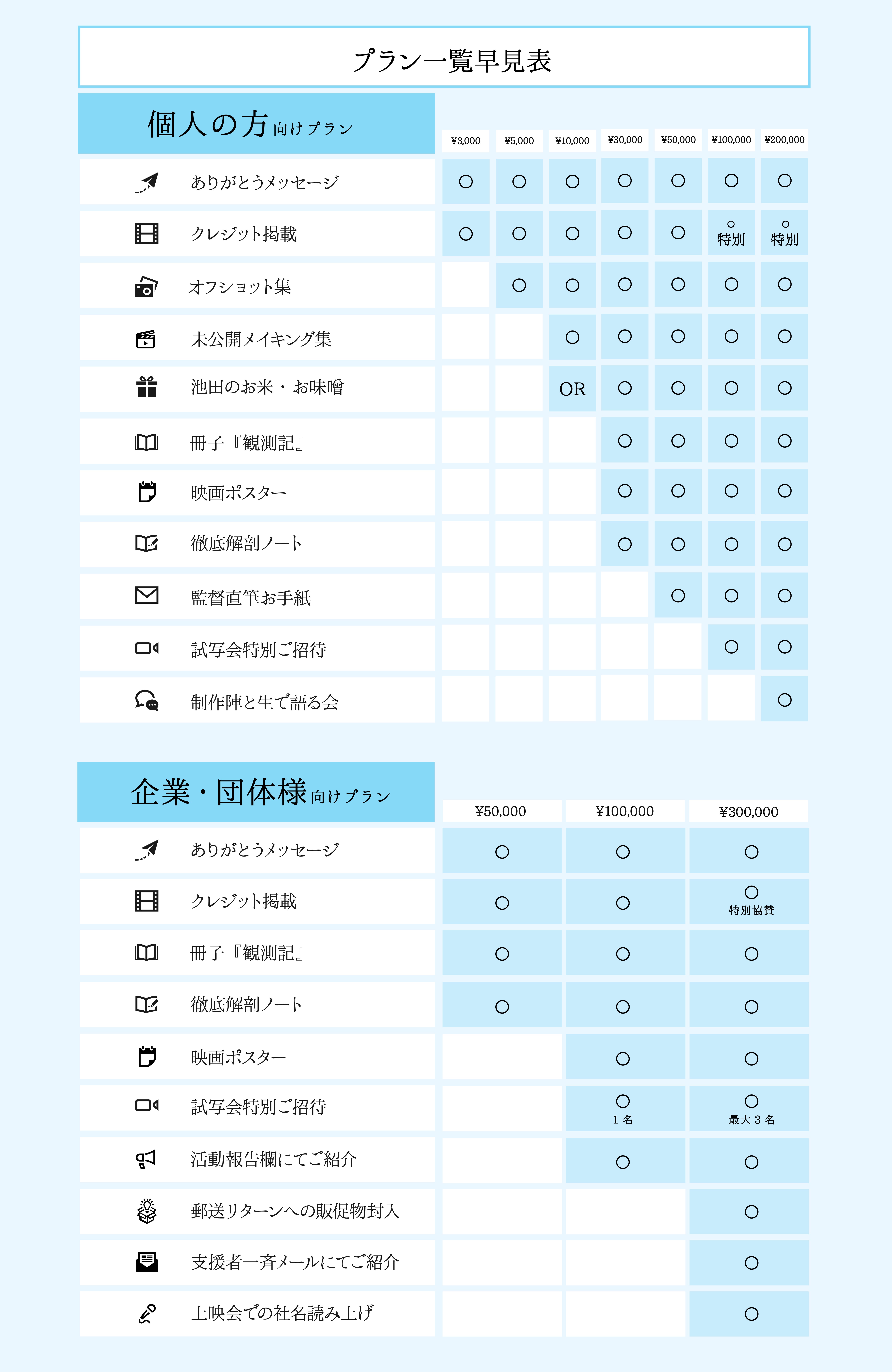 ● 関係者試写会特別ご招待 本編完成後、関係者限定の試写会へ特別にご招待します。2025年4月以降、東京都内の映画館を予定しています。当日お越しいただくことができない方へは、配給上映・自主上映の別に関わらず、無料で劇場でご鑑賞いただけるよう手配いたします。
