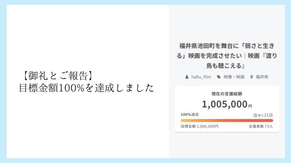 前作の長編映画『キャンバス』でクラウドファンディングを実施した際は、22日間で765,000円という結果だったことを考えると、より多くの方に『渡り鳥も聴こえる』を応援していただけているという実感があります。