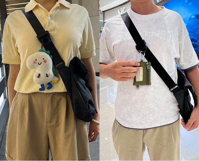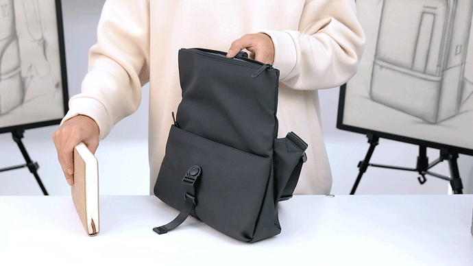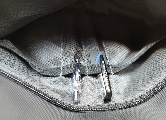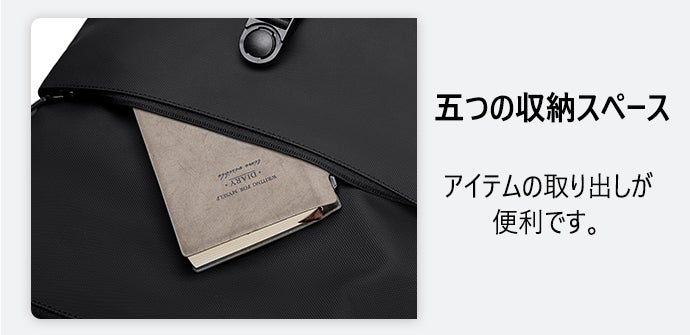 前側には5つの収納スペースがあり、鍵、イヤホン、ICカード、ペンなど、よく使うアイテムを入れることができます。
