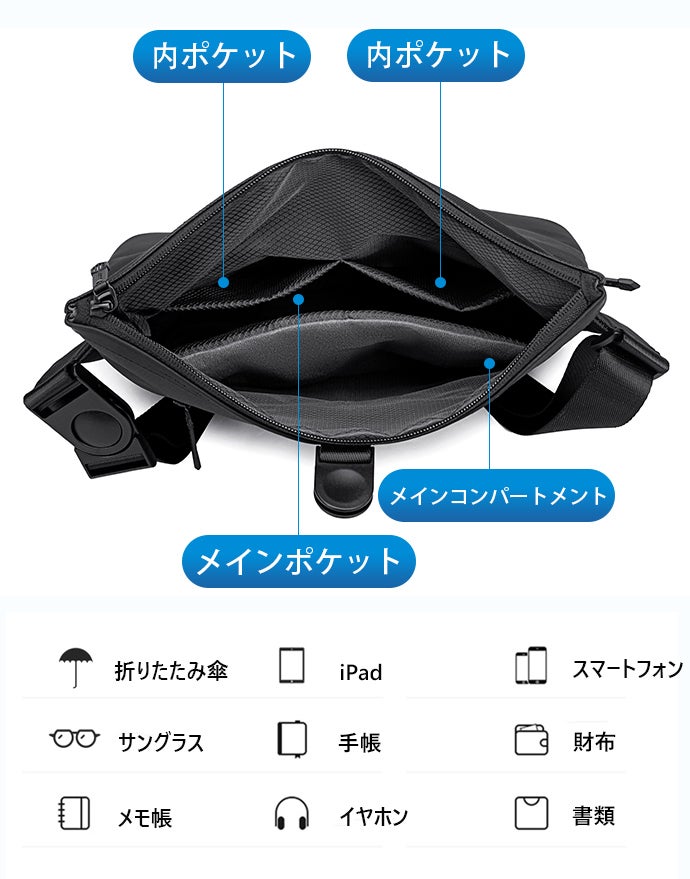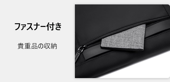 バッグポケットはファスナー付きなので、携帯電話、財布などの貴重品を入れるのにぴったりです。