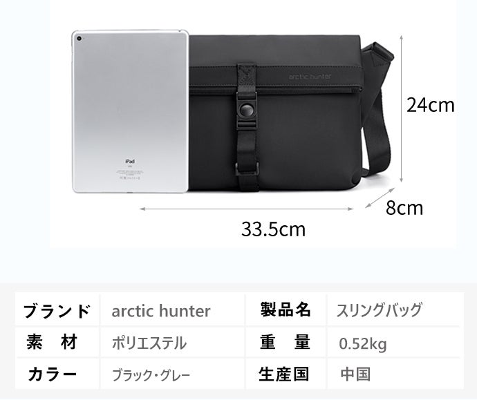 バッグの収納力は多くの人が重視する機能ですが、アークティックハンターのサイズは33.5x8x24cmと大容量です。