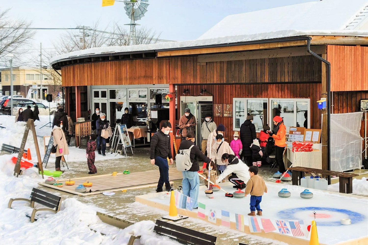 <冬遊び・カーリングの歴史を知ろう> アイスのカーリング、フロアカーリング、遊戯スペースが並んだ前回の様子 冬のスポーツの一つである『カーリング』は1970年代後半、北海道でカナダとの文化交流として道内21市町で講習会を開催。いち早くカーリングを導入したのが十勝の池田町でした。室内カーリング場での競技が主流となった今でも池田町と音更町(おとふけ町)には屋外のカーリング場が稼働してます。