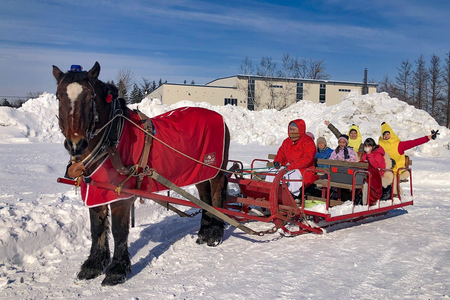 いつもは帯広の街中で「馬車BAR」を引く🐴ムサシコマが、大きな雪ソリを引いて麦音を巡ります。 ここ十勝では、トラクターが無い時代は馬たちが畑を耕す仕事をしていました。パンの原料は小麦ですが、昔は馬の働きによって生産されていたんですね。その「働く馬の歴史と文化」を大切にしてココ麦音の敷地の中に作られた小麦畑は毎年、馬耕の実演を行っています。もっと馬たちの仕事ぶりを知って欲しい。だから冬は🐴コマちゃんが麦音で馬そりで子供達に乗ってもらうプログラムをやるんですよ。