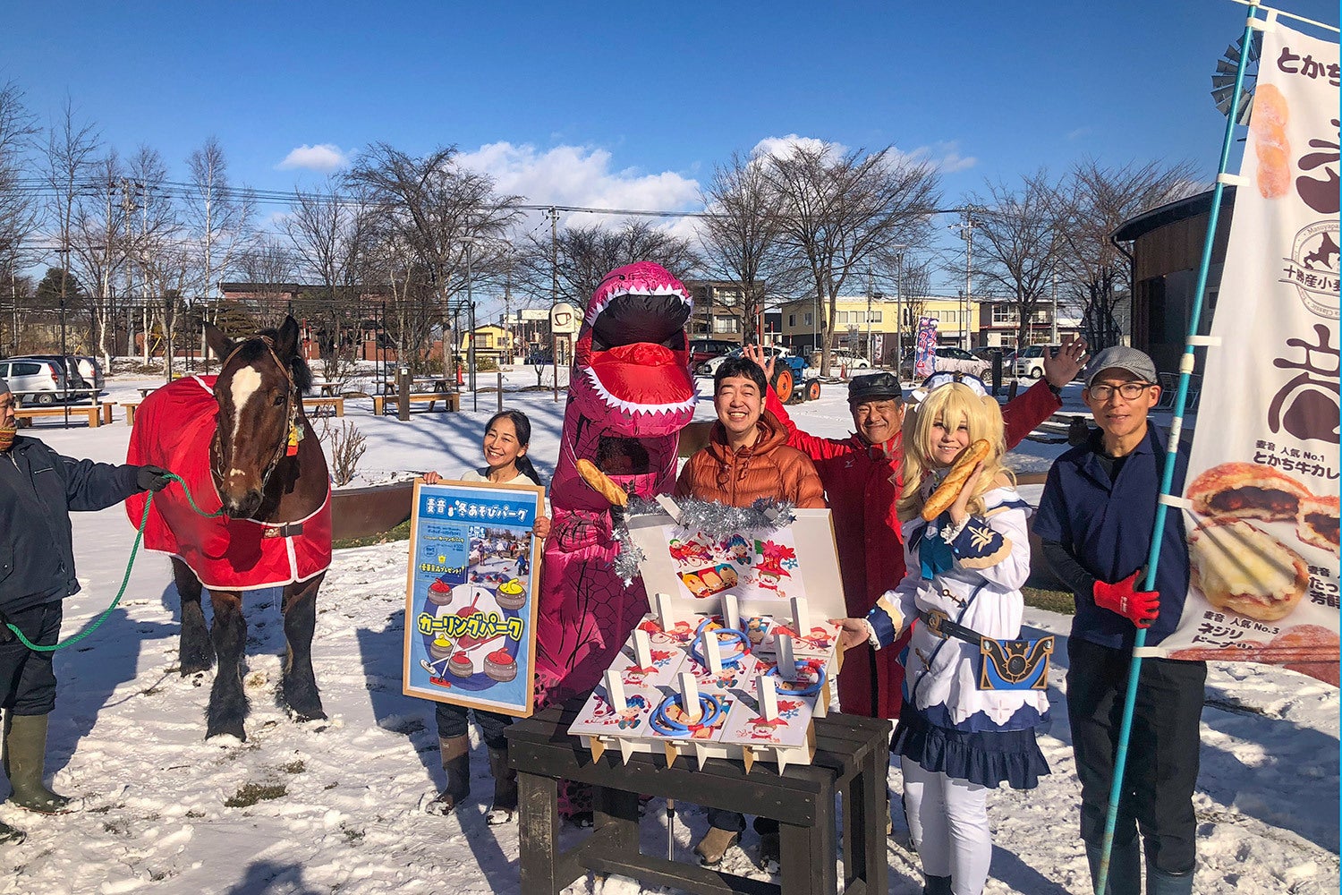 <冬遊び・新しい仲間が集まります> 12月13日、新聞社さんに取材してもらいました。日替わりで参加してくれる新しい仲間と一緒に記念写真 2回目になり、一緒に「冬遊びパーク」に新しい仲間が増えました。のべ16日間のロングラン開催のうち、参加が可能な日にスペシャルプログラムで盛り上げてくれる皆さんです。 12月13日、地元の新聞社さんに開催告知の取材をしてもらうタイミングで、麦音で集まった時の写真ですが、 大きな🐴コマちゃんと並んで、ティラノサウルスやコスプレイヤーさん、真ん中で輪投げキットを持つのはイラストアーティストのAkky.t(アッキー)さん、とんでもなく楽しそうな「冬遊びパーク」になりそうです。<イベント状況を知る> 北海道にお住いの方、イベントにお起こしいただける方にはぜひ体験頂き、来年も開催して欲しいと思った方は是非ご支援お願いいたします。また遠方や様々な状況でお越しいただけない方へイベントの趣旨にご賛同いただいた方など、SNSや公式HPでイベント状況を発信しております