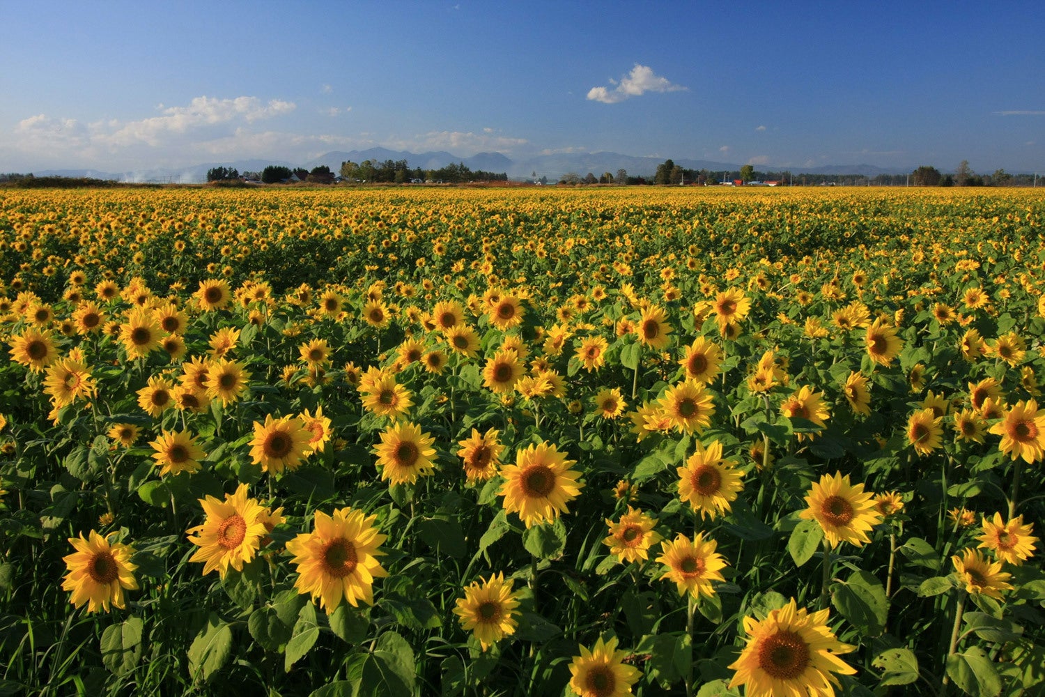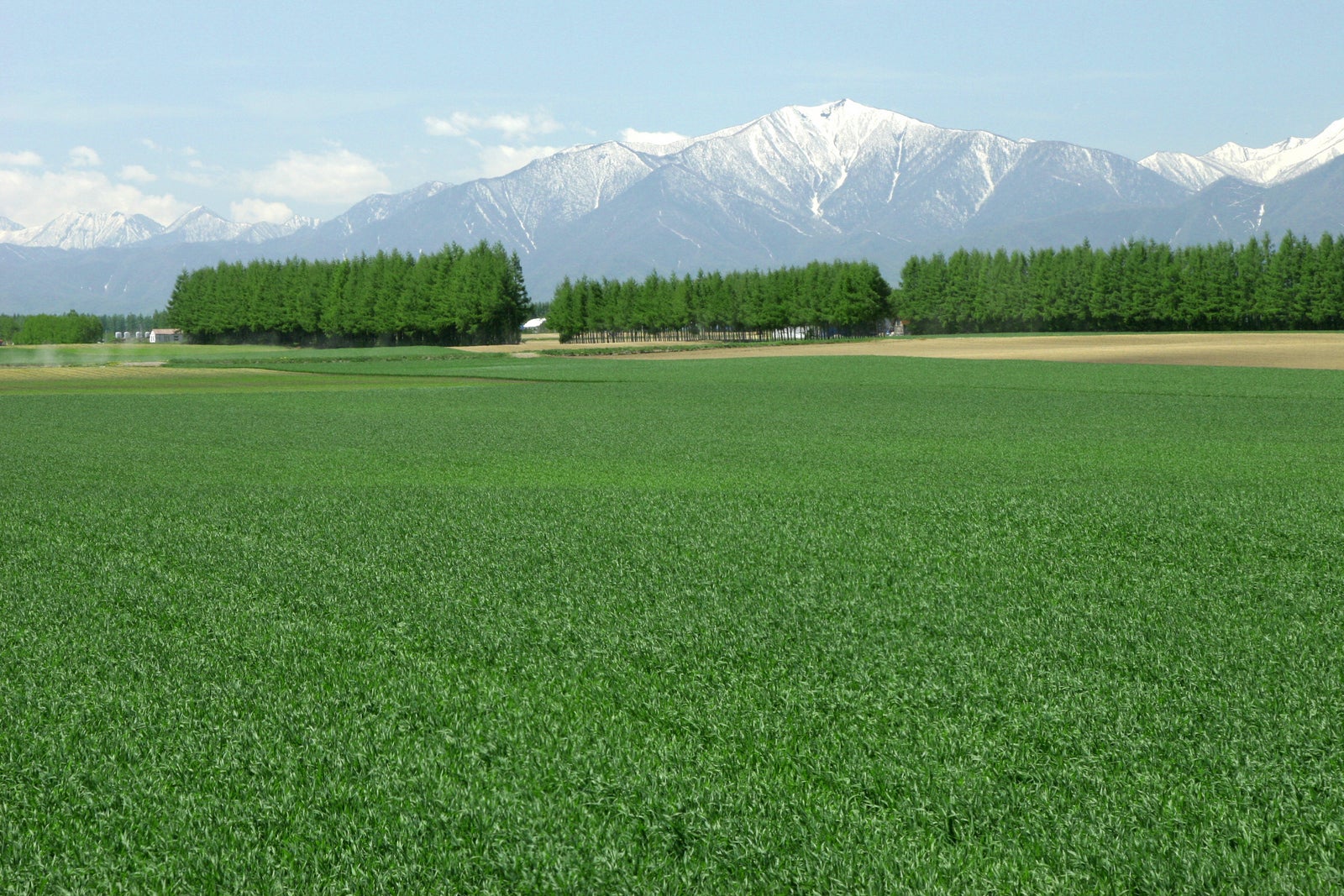 【春】小麦畑と日高山脈には雪が残る風景が美しい十勝です 【夏】ひまわりが綺麗に咲く畑も。でも肥料用のなんですよ
