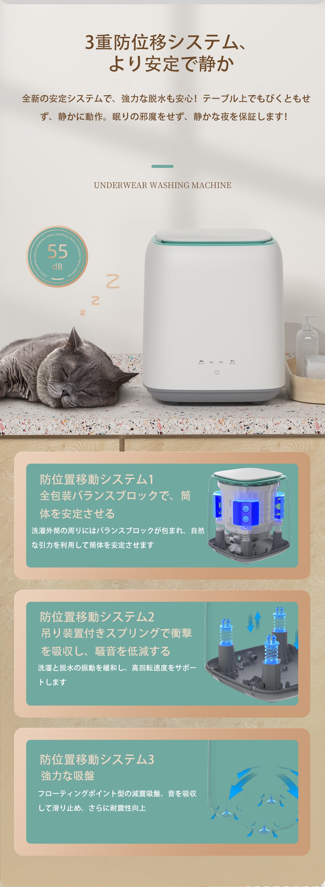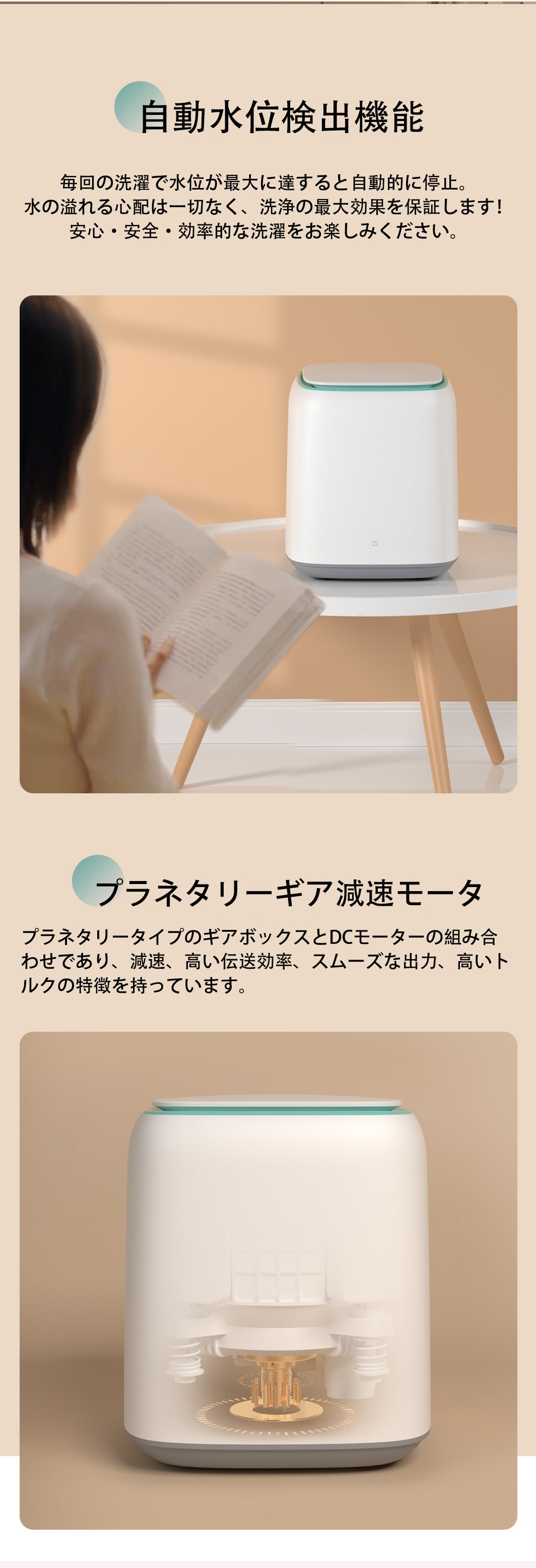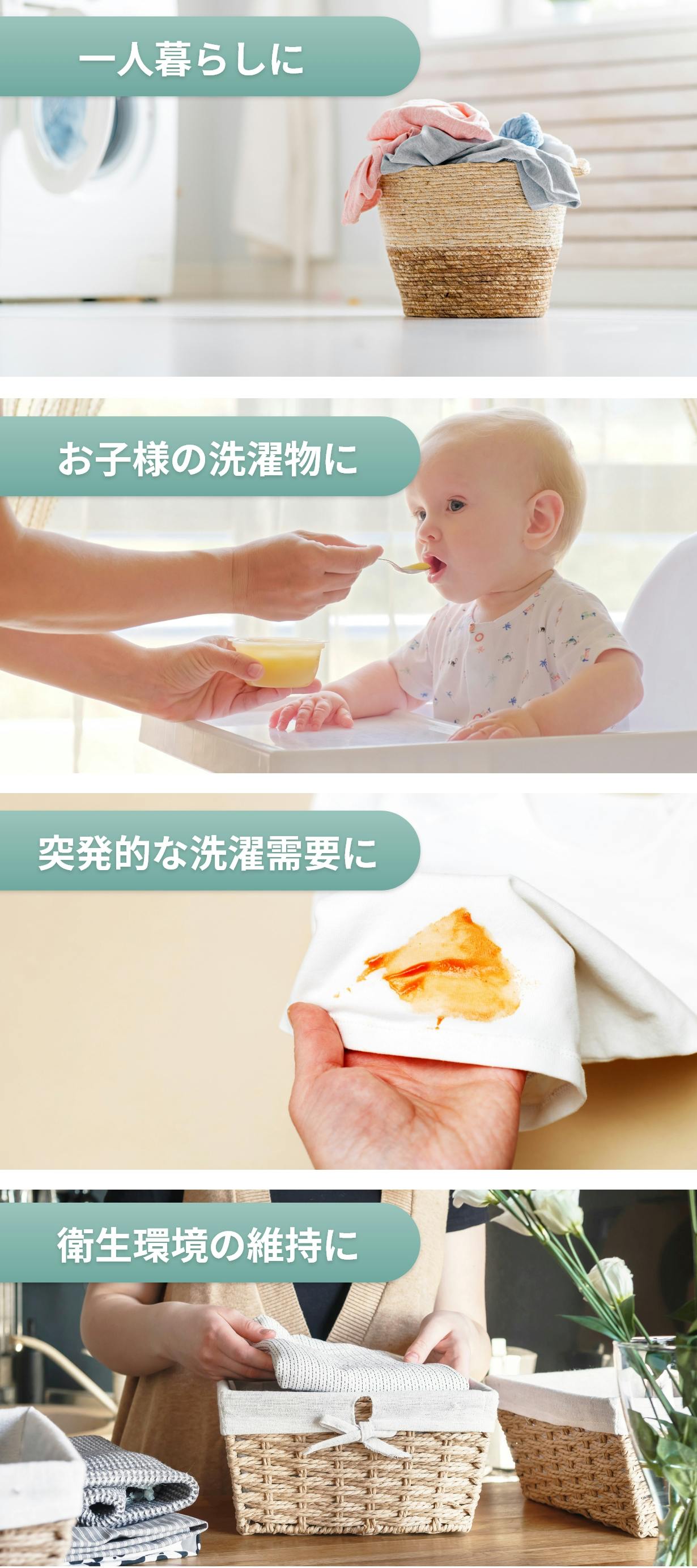 水を入れたコップを置いてもこぼれないくらいの低振動。夜になって気付いた洗濯物や、小さな赤ちゃんがいるご家庭でも、環境を気にせずにお洗濯ができます。