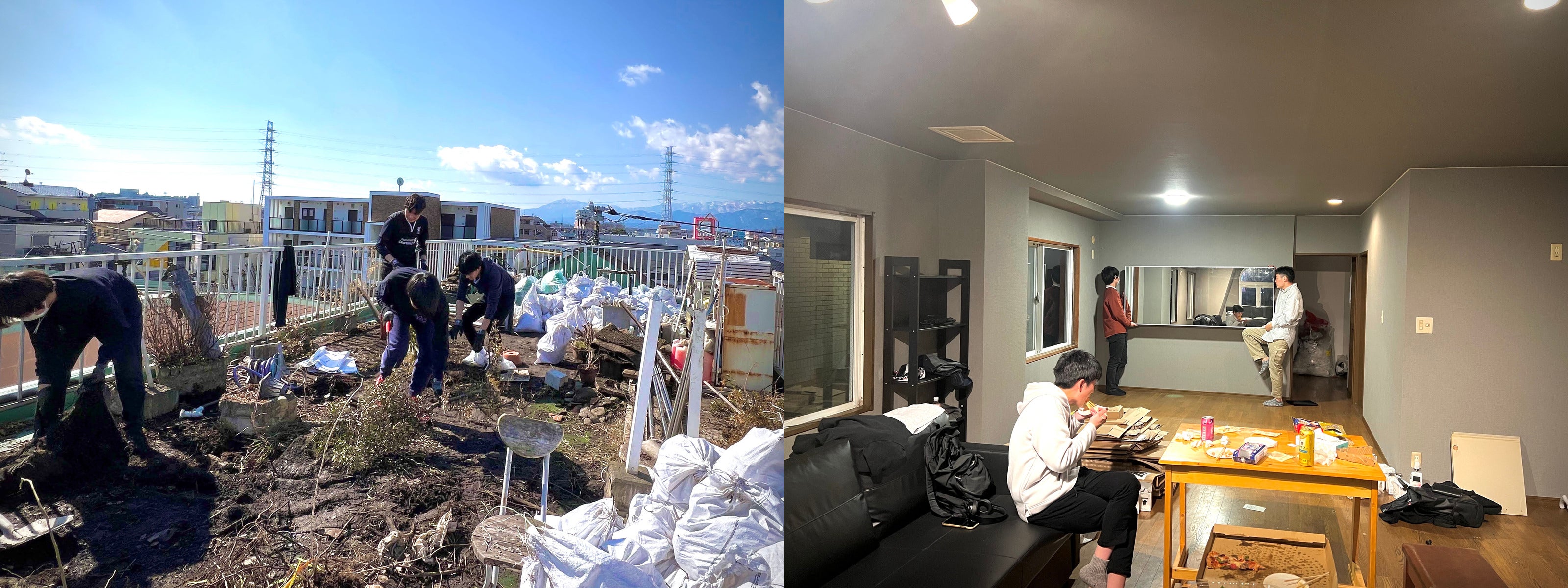 築25年の戸建住宅のうち祖父母の家だった部分を、セルフリノベーションで綺麗にしたのがBEGOPEN-HOUSEです。当時の屋上は、庭いじりが趣味だった祖父の家庭菜園でしたが、高齢で手入れできなくなった後はほぼ荒地状態でした。リノベーションの際に、それを仲間と4トン超の土や花瓶を降ろし、新たに人工芝の庭園として綺麗に整備しなおしたんです。