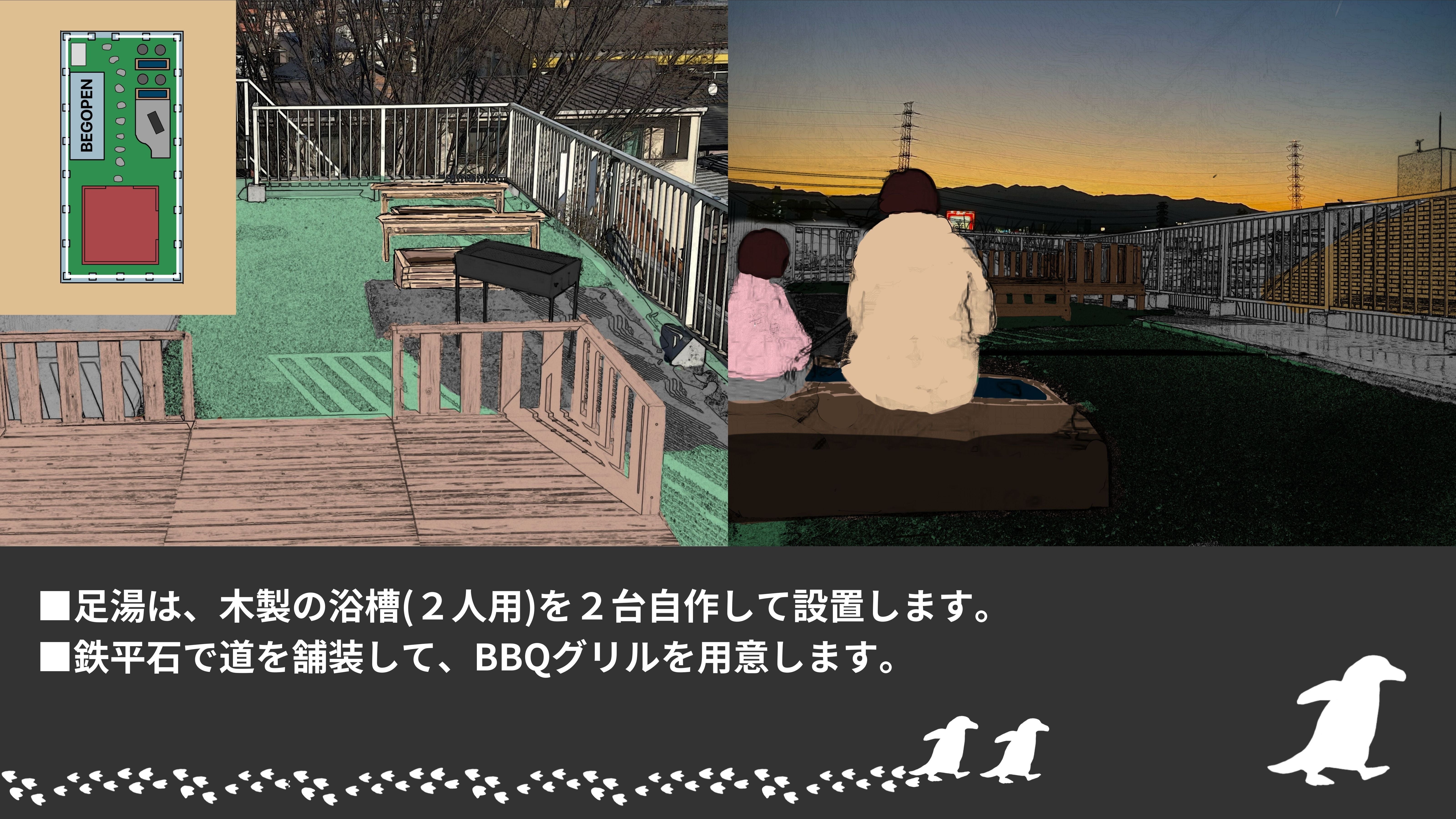 そこで今回、屋上に足湯を設置することで民泊施設としてはもちろん、その他のサービス利用の際にも屋上がBEGOPEN-HOUSEの1つの価値となることを目指します。足湯の醍醐味の1つは、浸かっている間のゆったりと流れる時間です。もちろん足の疲れを取るのも魅力ですが、この時間が生んでくれるコミュニケーションも唯一無二の価値があります。そんな屋上でのひと時を、「集いの場」では生んで行きたいのです。