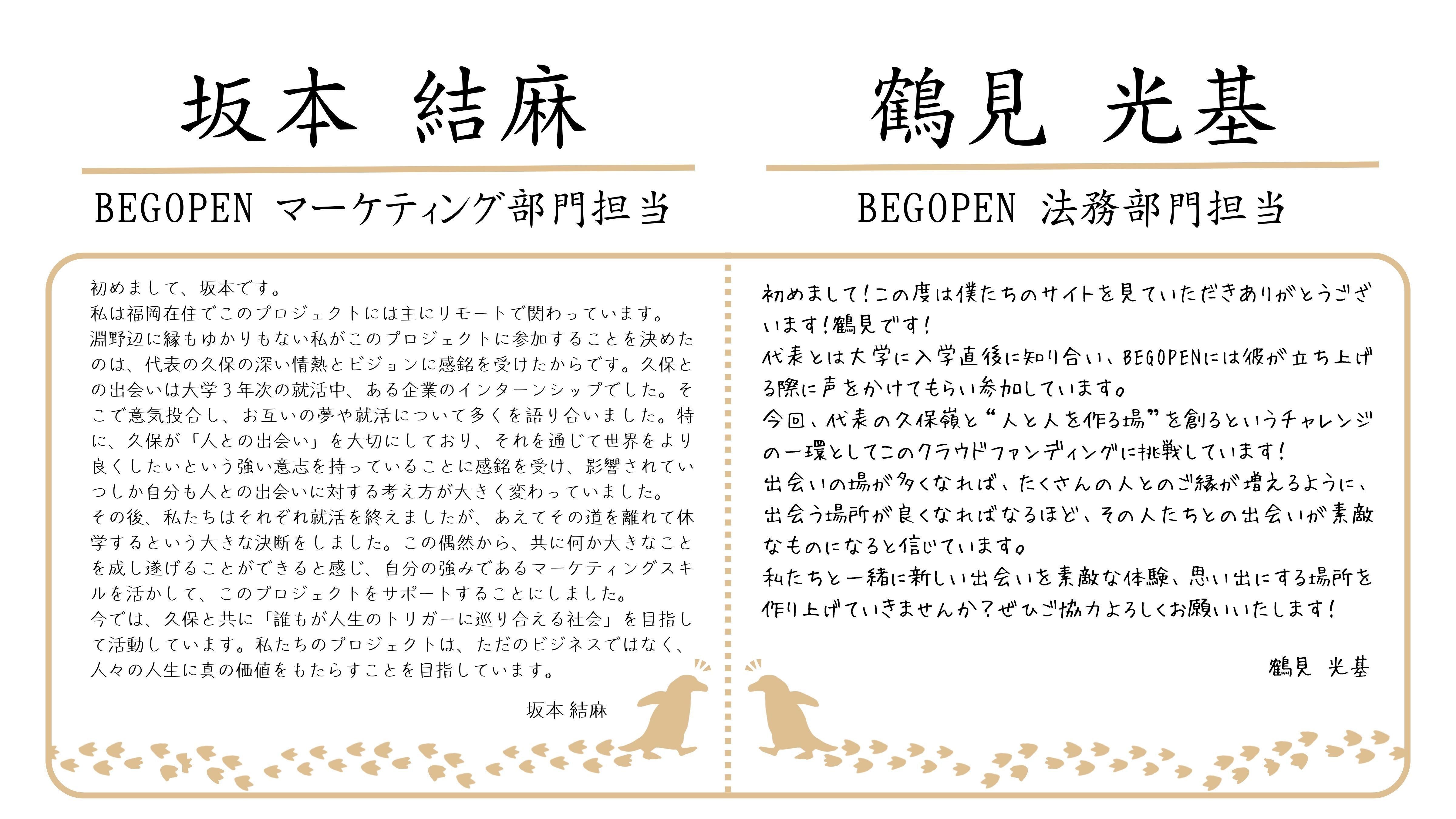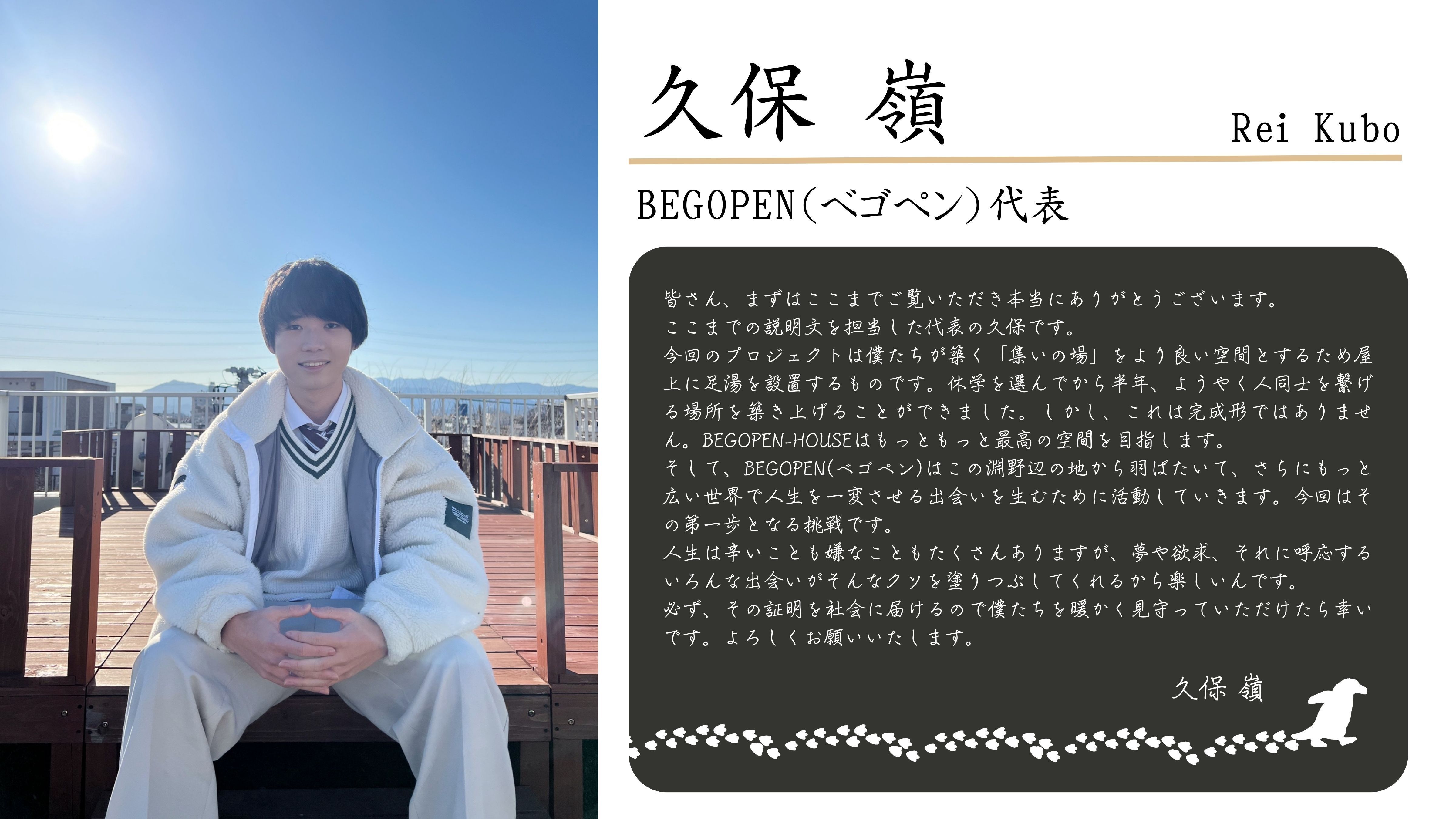 この活動の原点は、代表である久保の高校在学中の研究論文を起因としており、現在BEGOPEN-HOUSEを運営しつつ、当グループの最終目標はこうした社会を醸成するコミュニケーションアプリを開発し世の中に浸透させることです。この目標に向けたクラウドファンディングも今後始動予定ですので、僭越ながら僕たちの活動を継続して応援いただけたら幸甚です。
