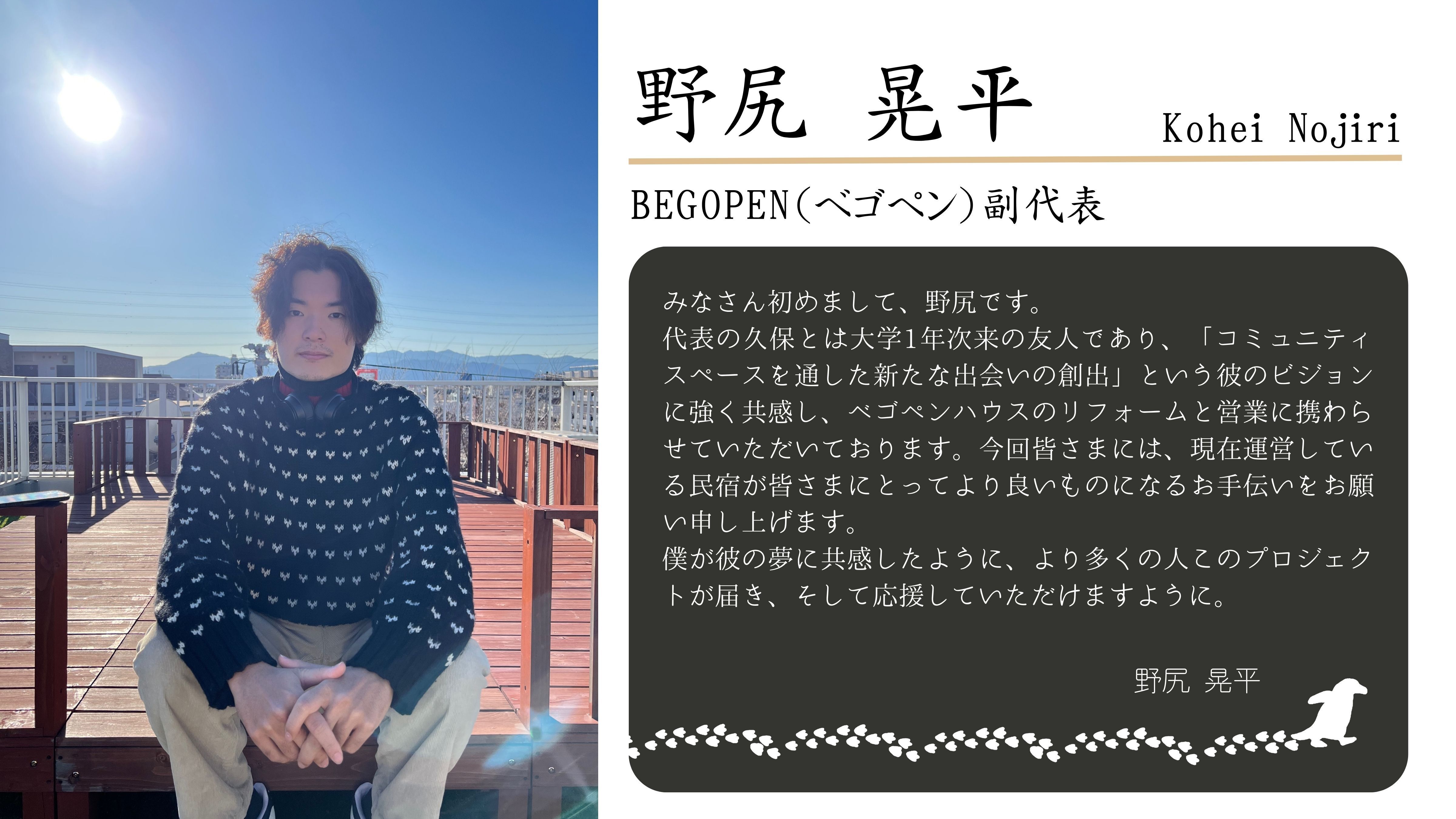 BEGOPEN(ベゴペン)は、代表の久保嶺(クボ レイ)を中心に立教大学と九州大学の学生で発足した事業グループです。MISSION「誰もが人生のトリガーに巡り合える社会を実現する」VISION「一人ひとりのWish(実現したいこと)を後押しする」ことを掲げて、現在はサードプレイスルーム"BEGOPEN-HOUSE"を運営しています。