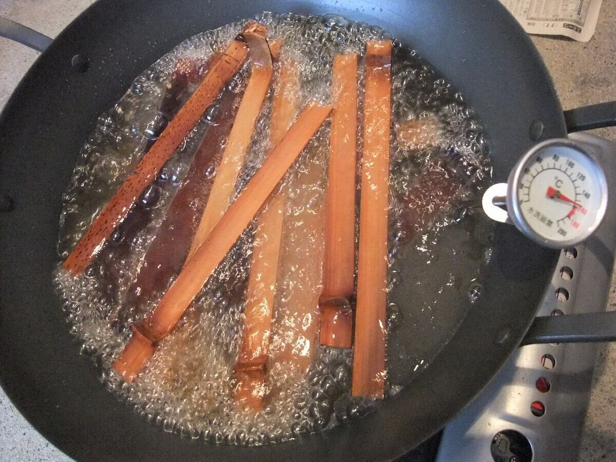 また、十分に乾燥した竹を油で揚げてまた油を抜くという手法です。