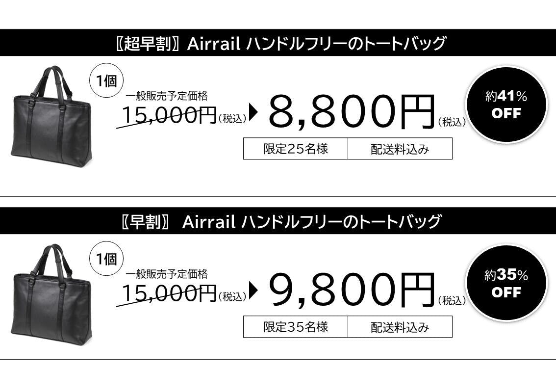 2024/01/01 05:34プロジェクトをスタートしてからあっという間に残りわずかとなりました。ご支援頂きましたみなさま、ありがとうございます。ご検討頂いておりますみなさま、是非、ご支援の程、よろしくお願い致します。新年1月7日までがんばります。新しい年となり、初仕事から新しいバッグ!オフィスに行くのが楽しくなること間違いなしです。私共もエンジン全開でAirrailのバッグを広めていく活動をしていきます。みなさまの応援もよろしくお願い致します。リターンであります、ハンドルフリーのトートバッグは一定数、確保しておりますのでプロジェクト終了後はお早めにお送りさせていただきます。今回ご支援頂きました資金は広告宣伝と新商品の開発費用(商品サンプル等)に活用させていただきます。引き続きの応援、よろしくお願い申し上げます。 もっと見る