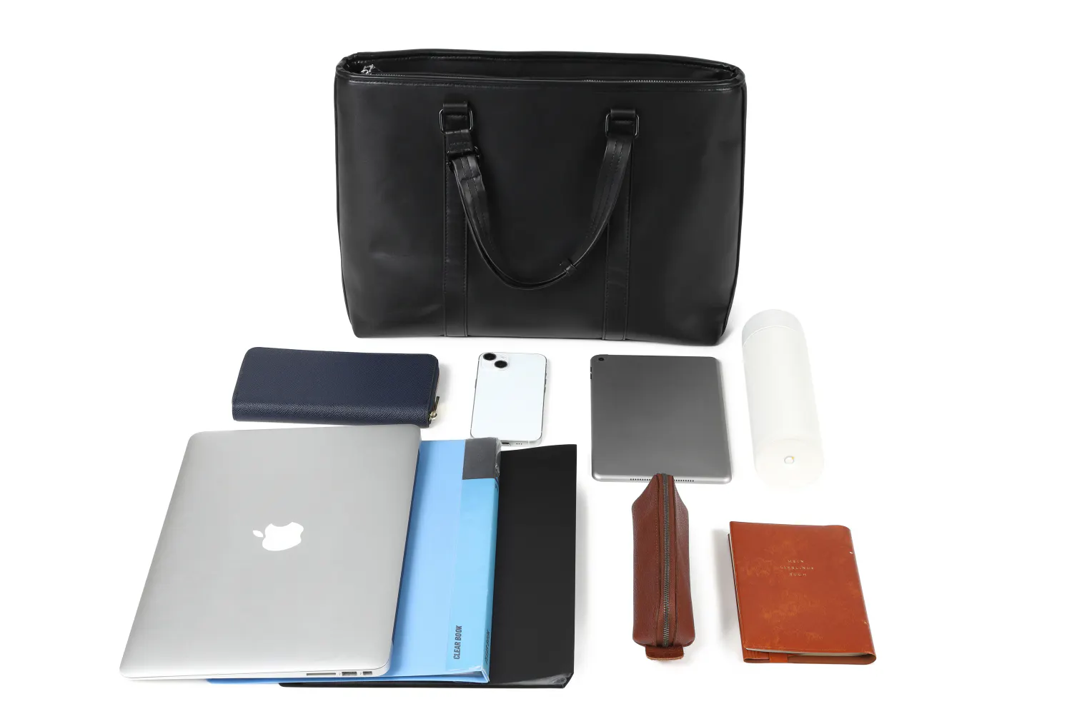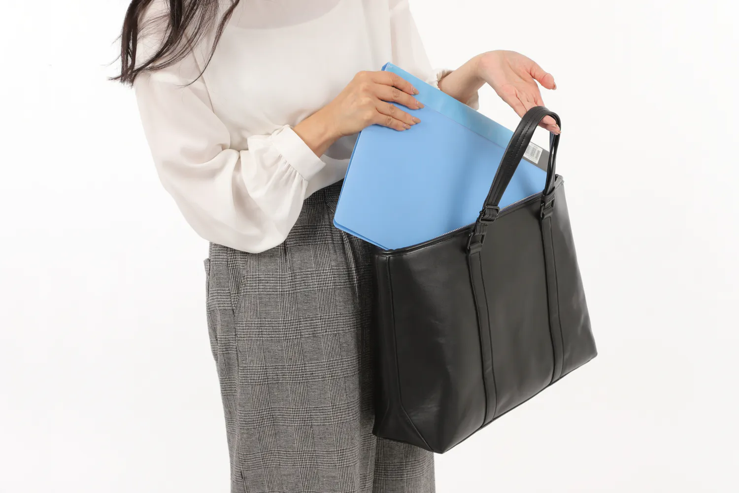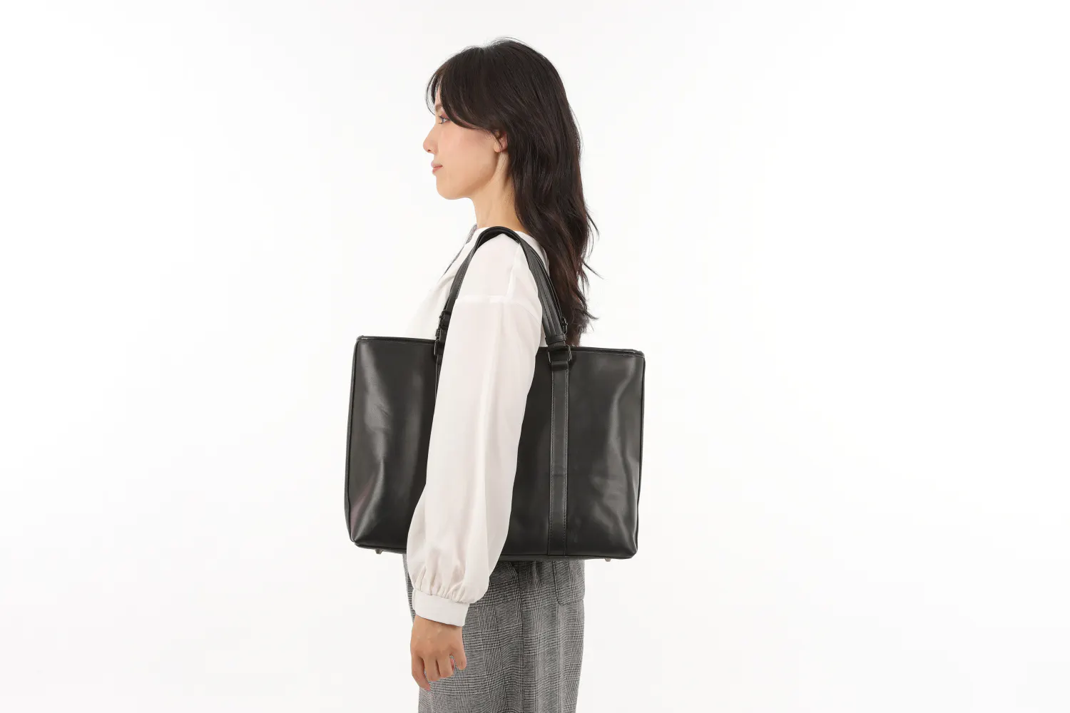 トートバッグは開閉口が大きく開くので、スリなどに中身が抜き取られやすいというリスクや他の人に持ち物を見られてしまうのが気になりますよね。このトートバッグは開閉口がファスナーで閉まるので安心です。ちょっとした荷物の出し入れがしづらいという不便さは、肩回りの長さをゆったり目にしてファスナーの開け閉めを簡単にすることをおススメいたします。ファスナーを閉めたときの収納力はマチ付きなのでほとんど変わることはありません。