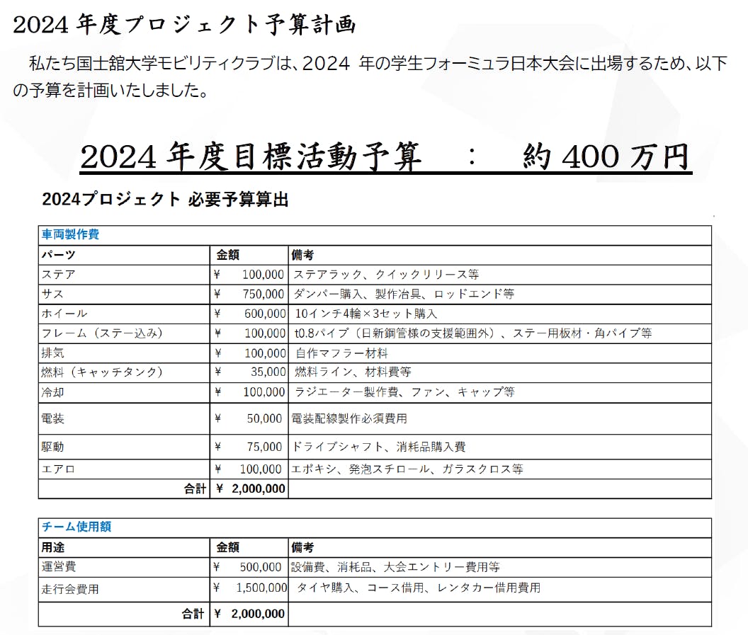 はじめまして。私たちは国士舘大学モビリティクラブで学生フォーミュラ活動をしています。