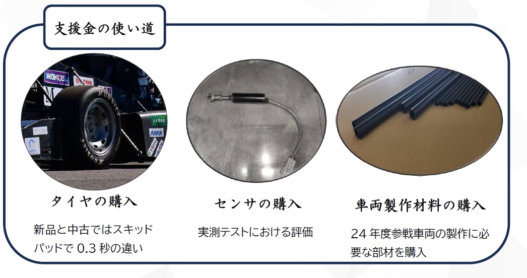 ご支援いただければ、私たちは夢を実現する力を得ることができ、学生フォーミュラ2024年での活躍が実現します。