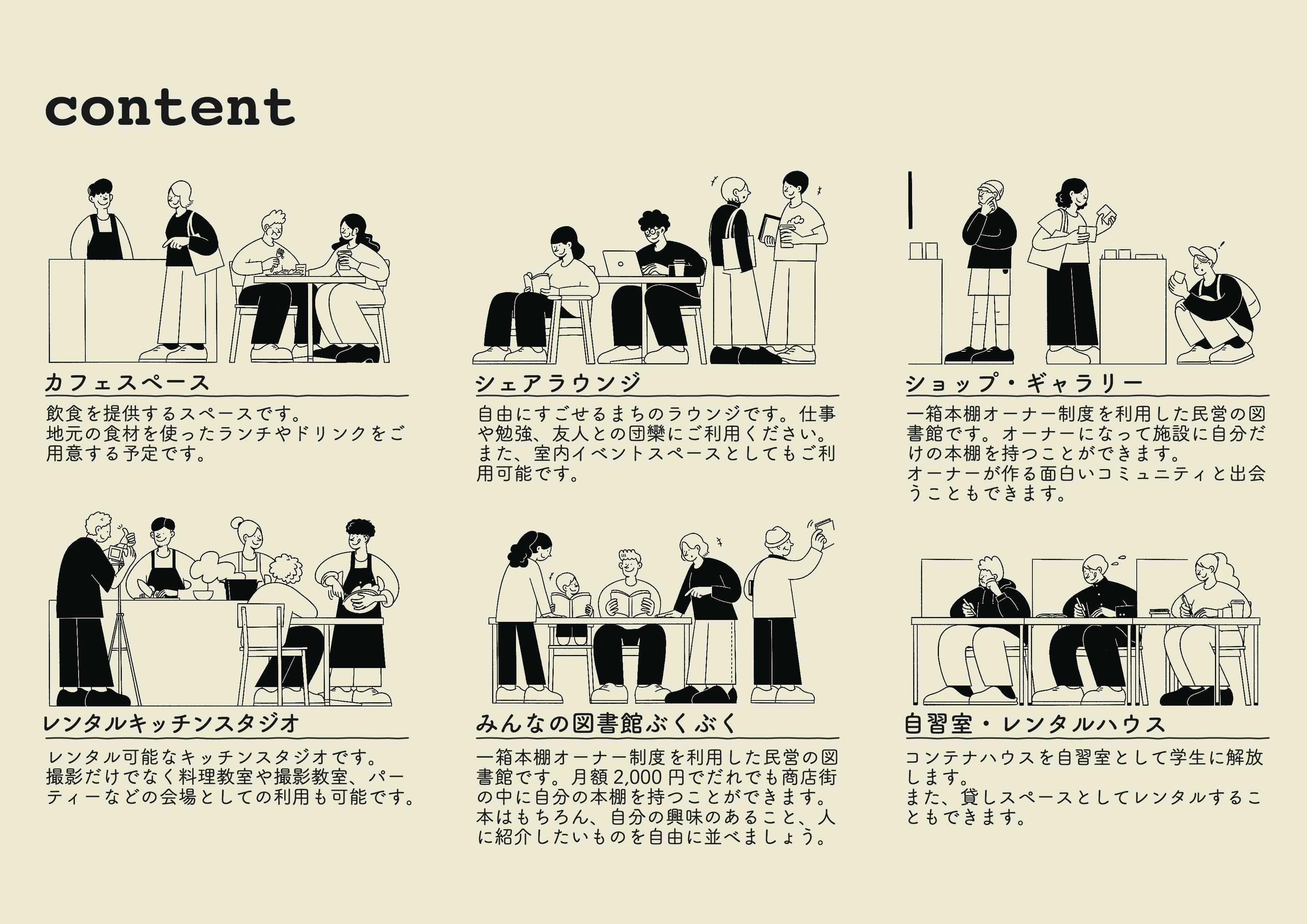 施設内には、ゆっくりすごせる「シェアラウンジ」「カフェ」、みんなが発信できる「みんなの図書館ぶくぶく」「レンタルキッチンスタジオ」「ギャラリー、セレクトショップ」学生に無料で解放している「自習室」の6つの施設があります