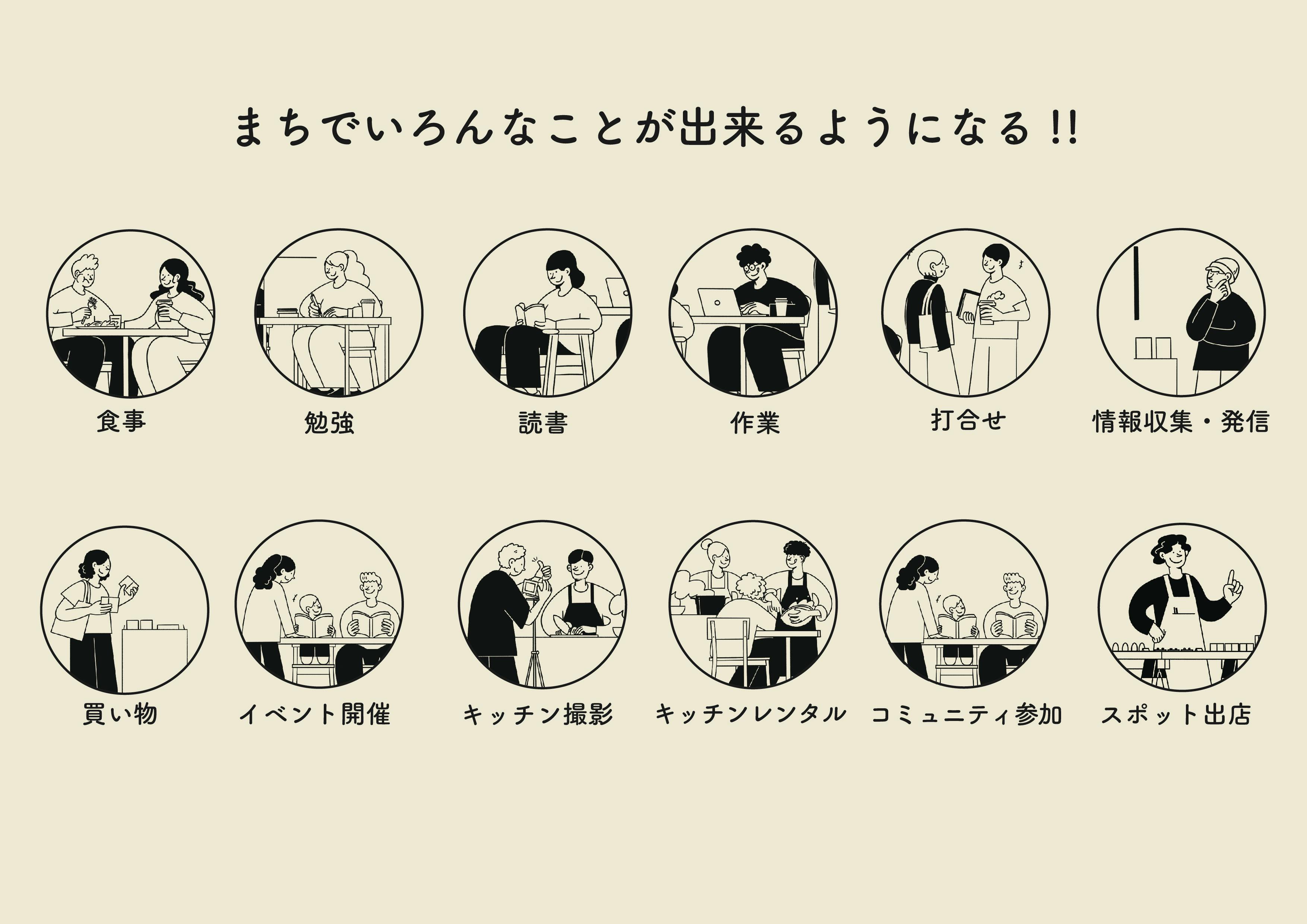 まちトープは、みんなが使えるまちの居場所です。シェアラウ ンジやテラス席、自習室などゆっくりとすごせる場所がたく さんございます。また、カフェや図書館、レンタルキッチン などより豊かな時間をすごしていただくための施設やサービ スもご用意する予定です。