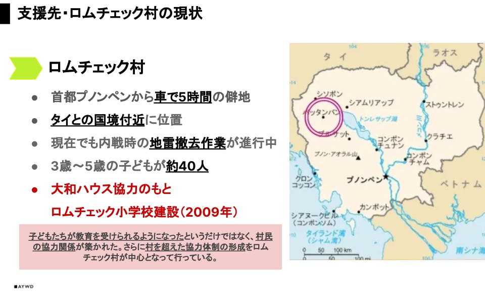 ロムチェック小学校は現地ニーズの収集を担当する開発系NGO・BFDと建設候補地を視察した際に最も学校建設のニーズが高かったロムチェック村を建設地として決定し、大和ハウス株式会社様のご協力のもと、建設いたしました。
