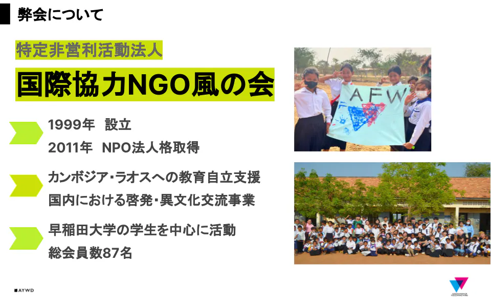 弊会はすべての子供たちが未来への希望を持てる社会を目指し、現在はカンボジアとラオスへの教育支援や日本の学生との異文化交流を中心に活動しています。